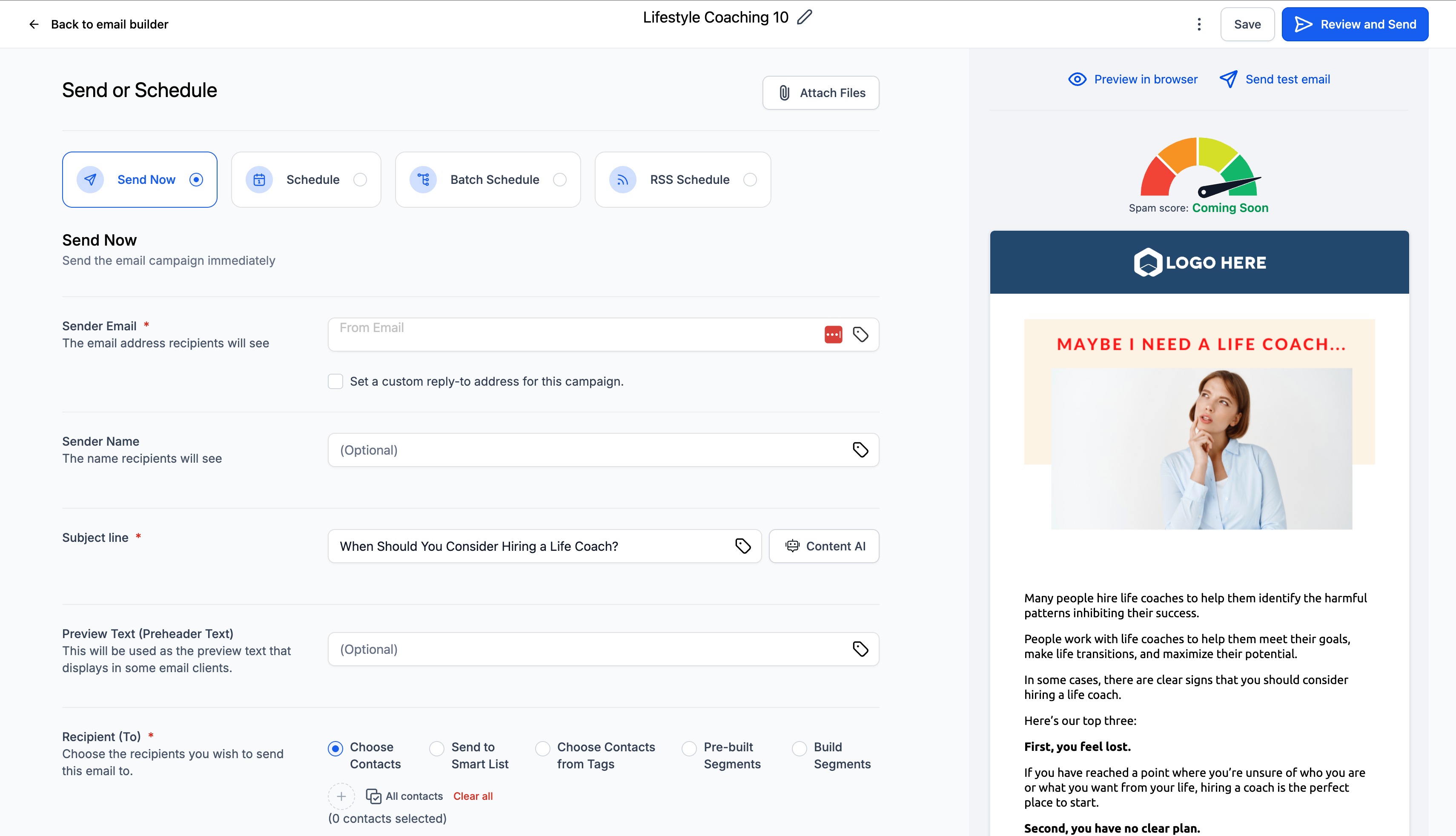 - How to send a Regular Email Campaign (Send Now or Schedule)