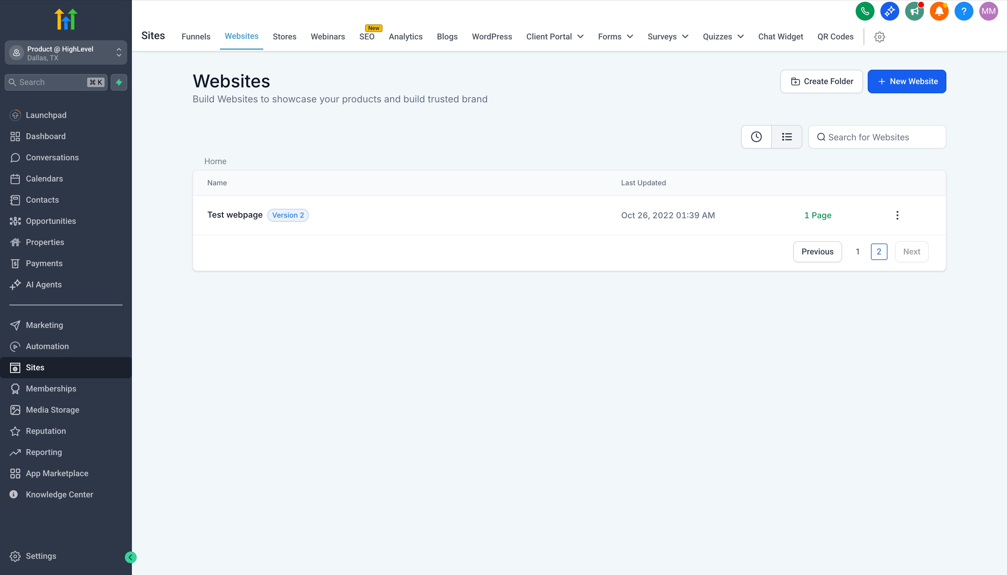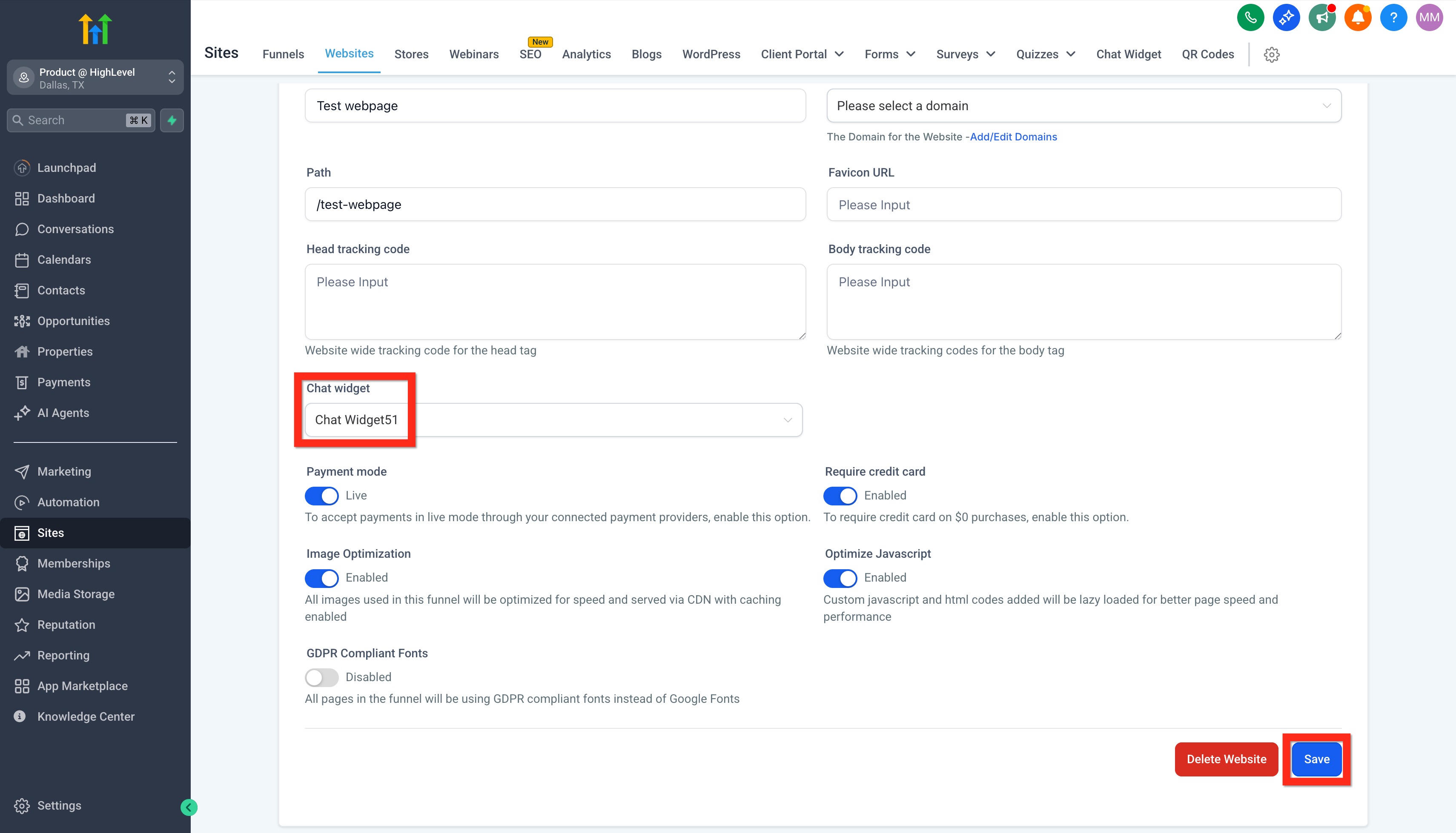 - Navigate to Sites > Websites OR Sites > Funnels
