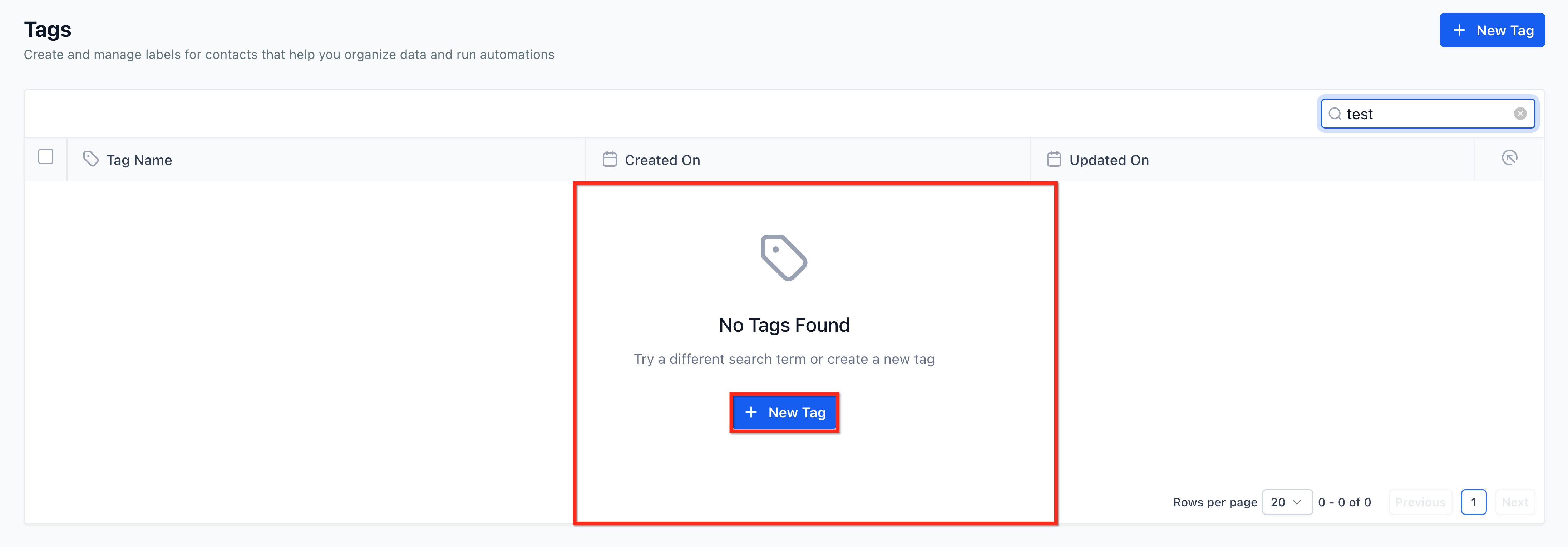 The search bar filters tags instantly based on entered keywords. If no results are found, a “No Tags Found” message appears. Pagination allows smooth navigation through large tag lists without performance issues.