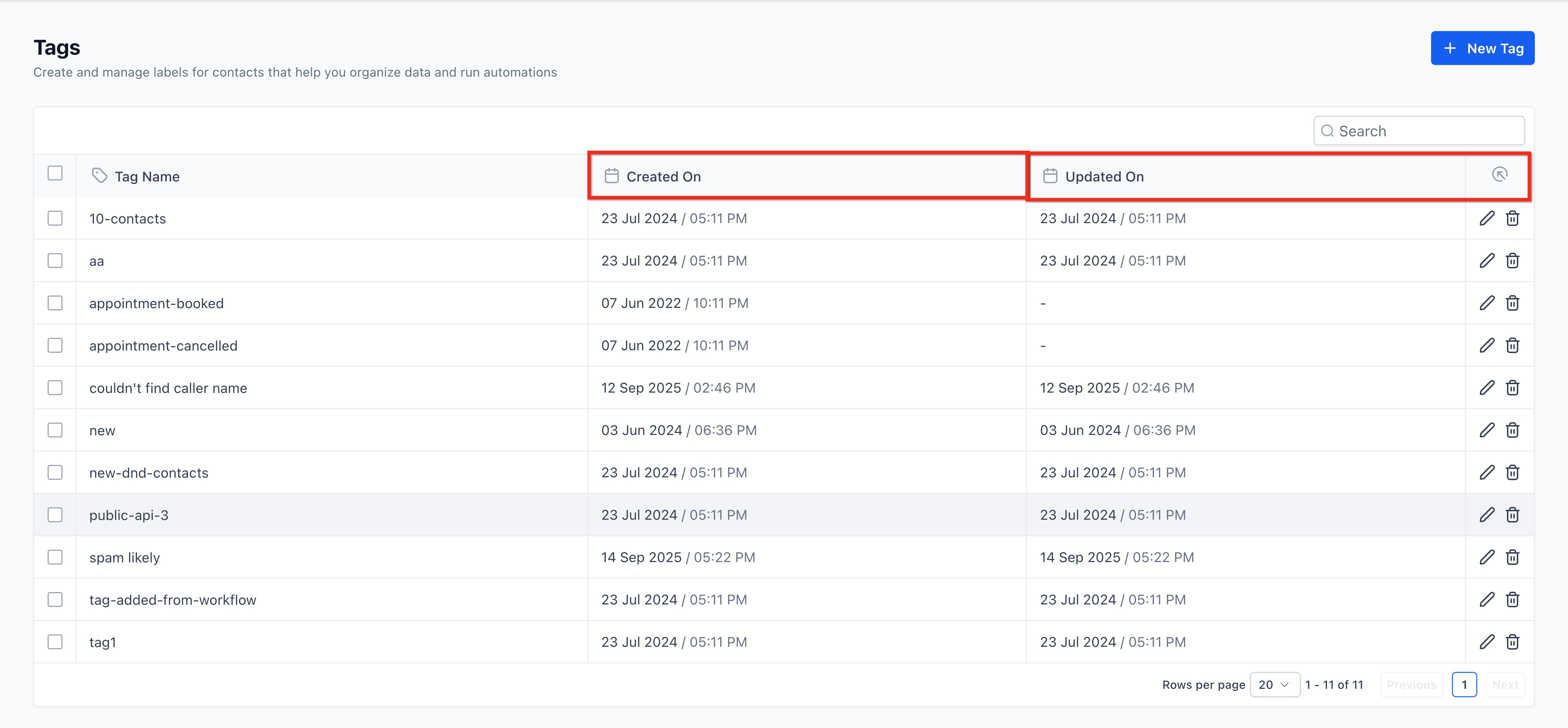 Each tag now includes Created On and Updated On columns, allowing users to quickly review when tags were added or modified. This improves audit accuracy and data hygiene.