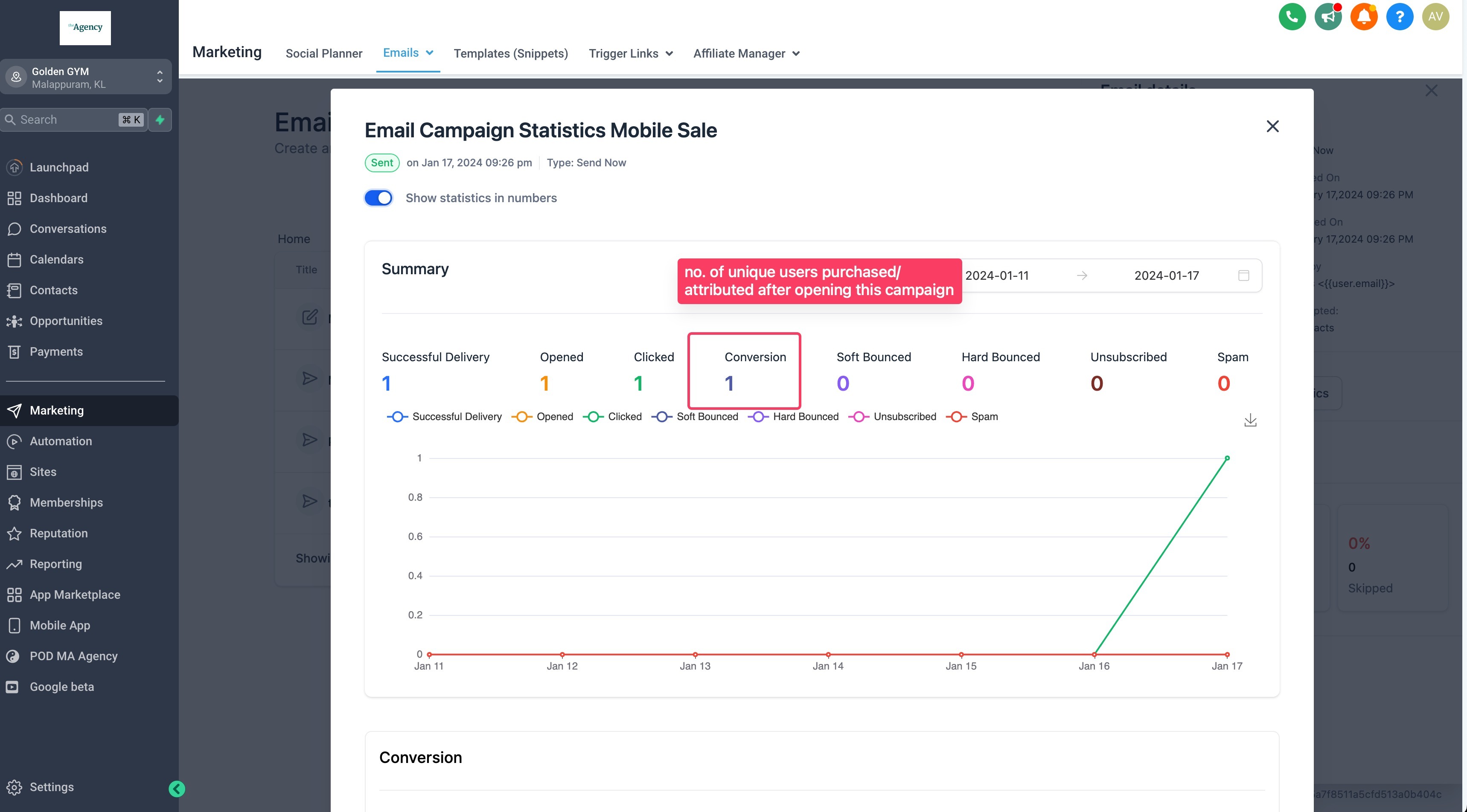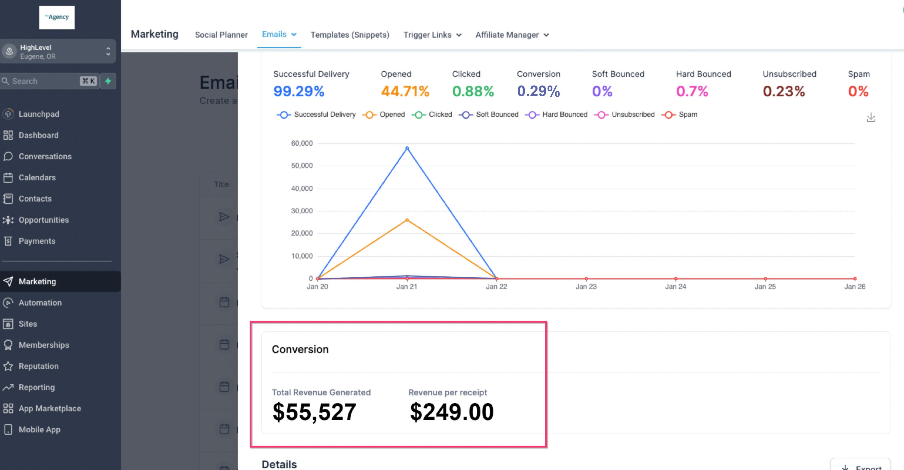 In the "Conversion" section, you'll see an overview of "Total Revenue Generated" as well as "Revenue per receipt" generated from the email campaign.