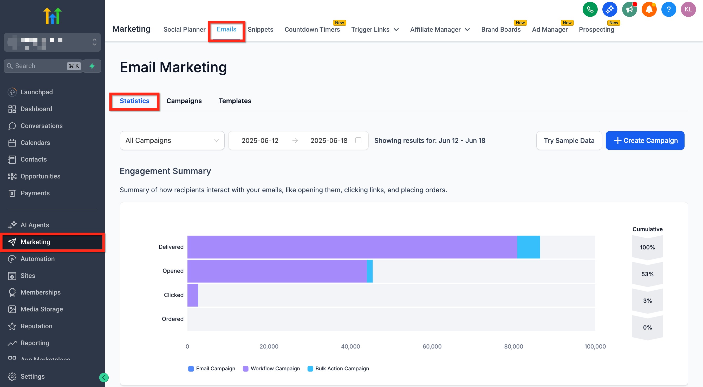 The All-in-One Dashboard is a centralized hub in HighLevel where you can view performance metrics for every email sent through Campaigns, Workflows, and Bulk Actions. Rather than switching between tools, you now have a consolidated view that streamlines email performance tracking and planning.