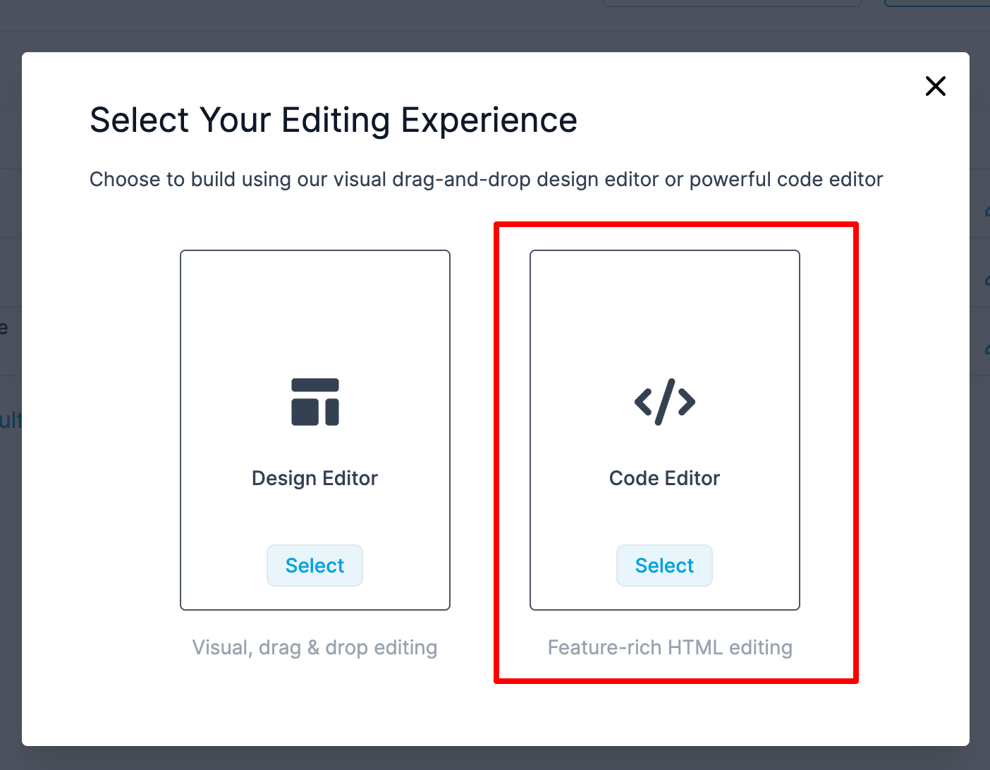 3. There will be a popup window with the option of Design Editor (drag and drop builder) and Code Editor (HTML builder). The user needs to select the Code Editor.
