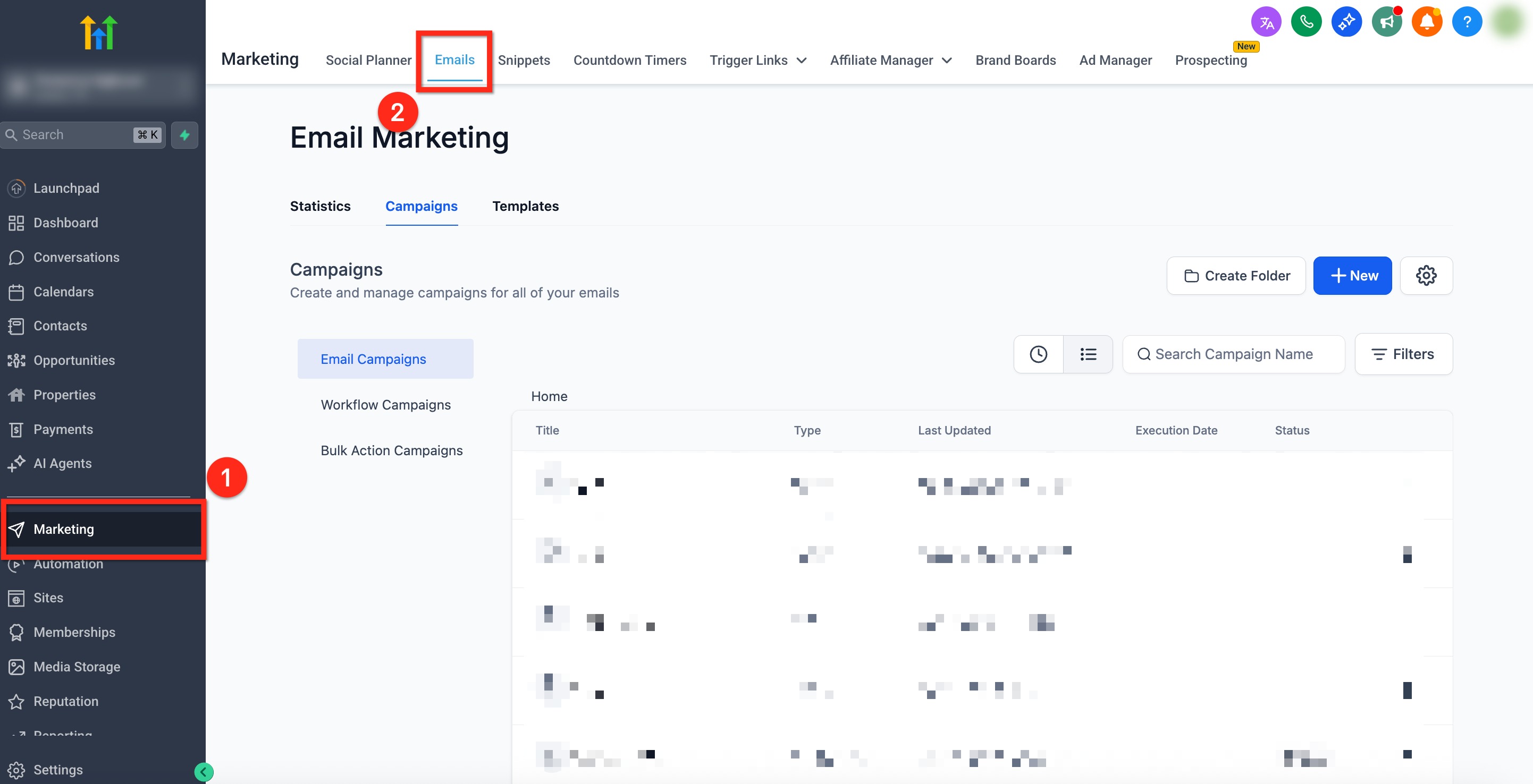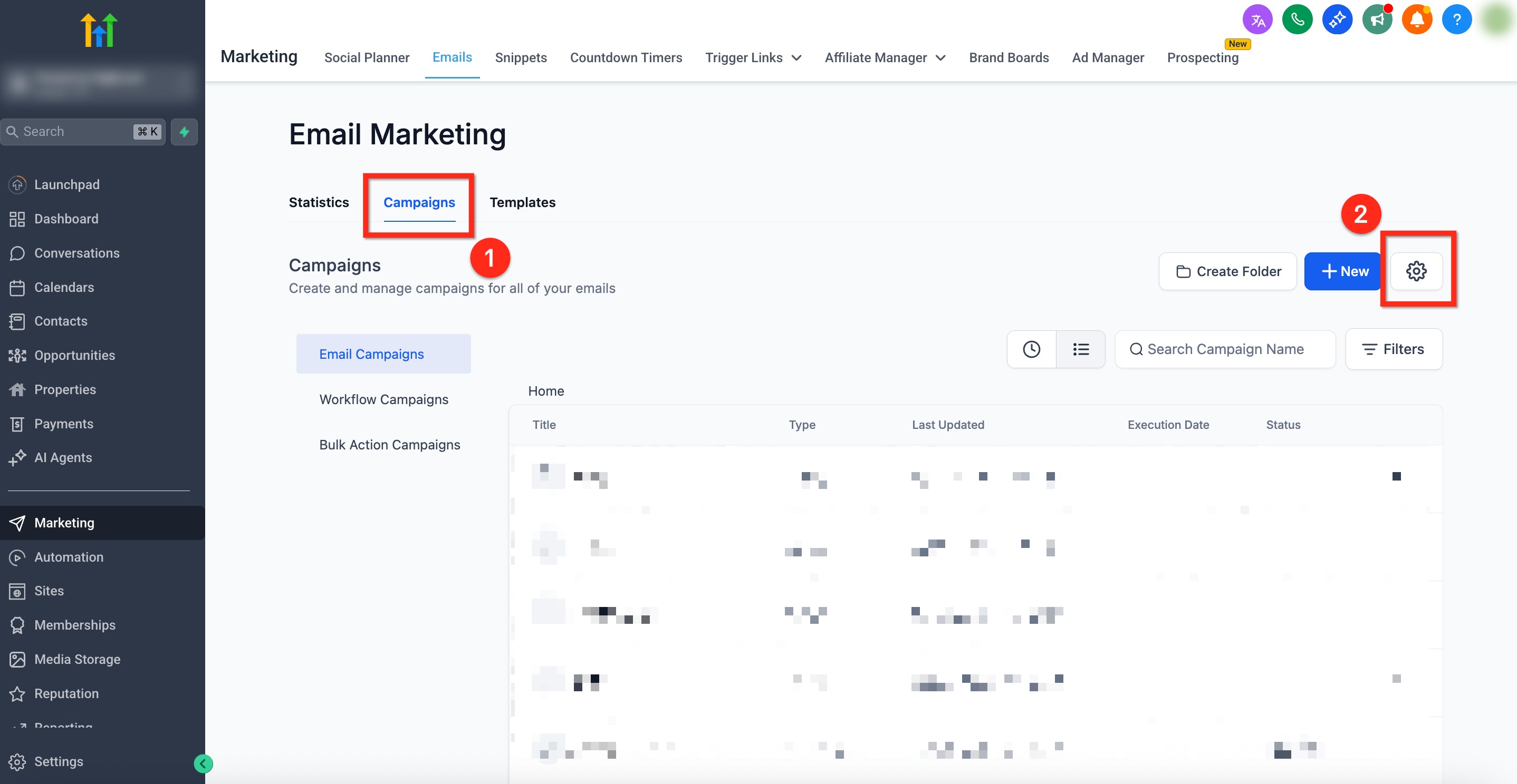 - Using the secondary navigation ribbon, choose Campaigns