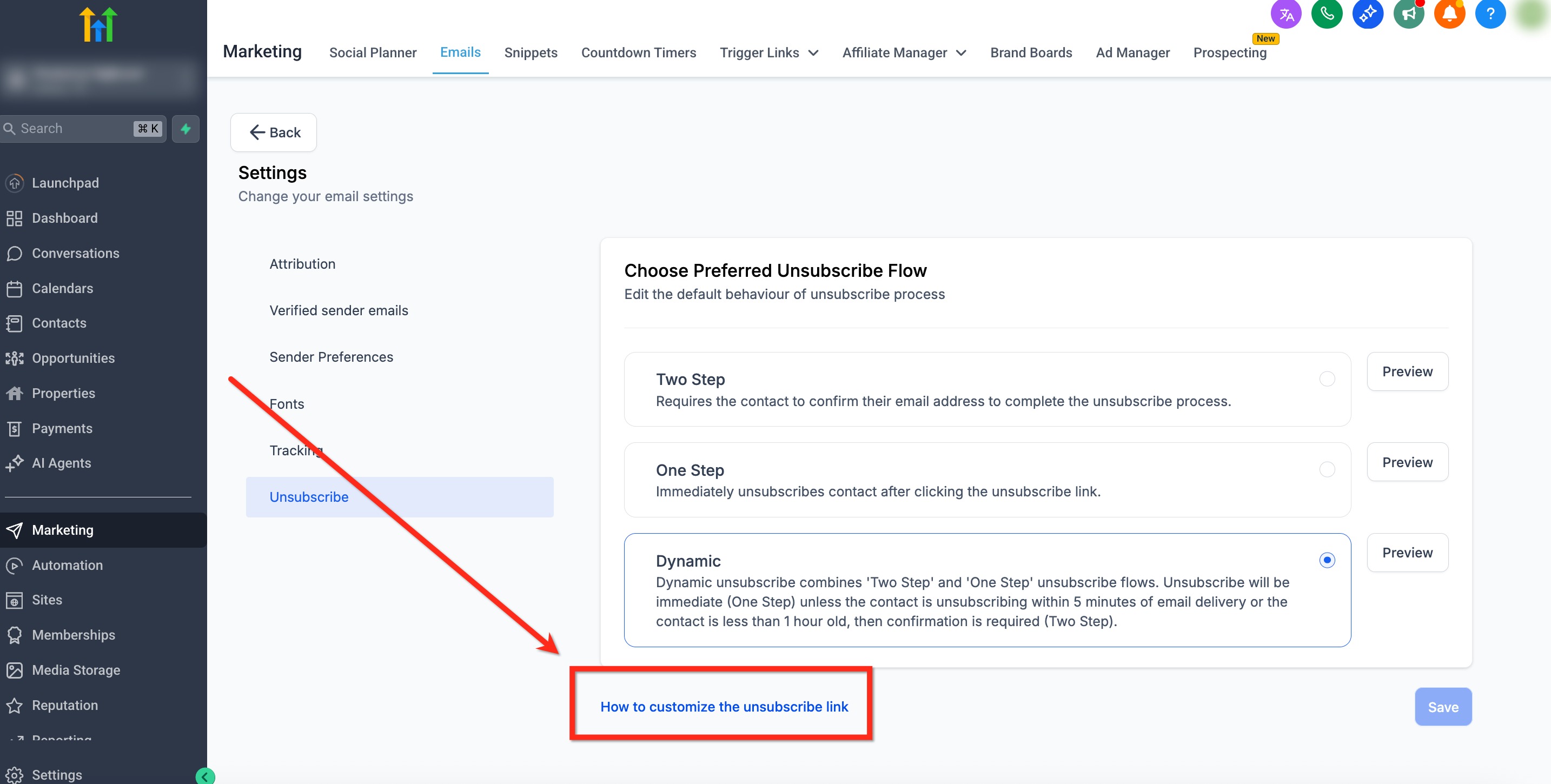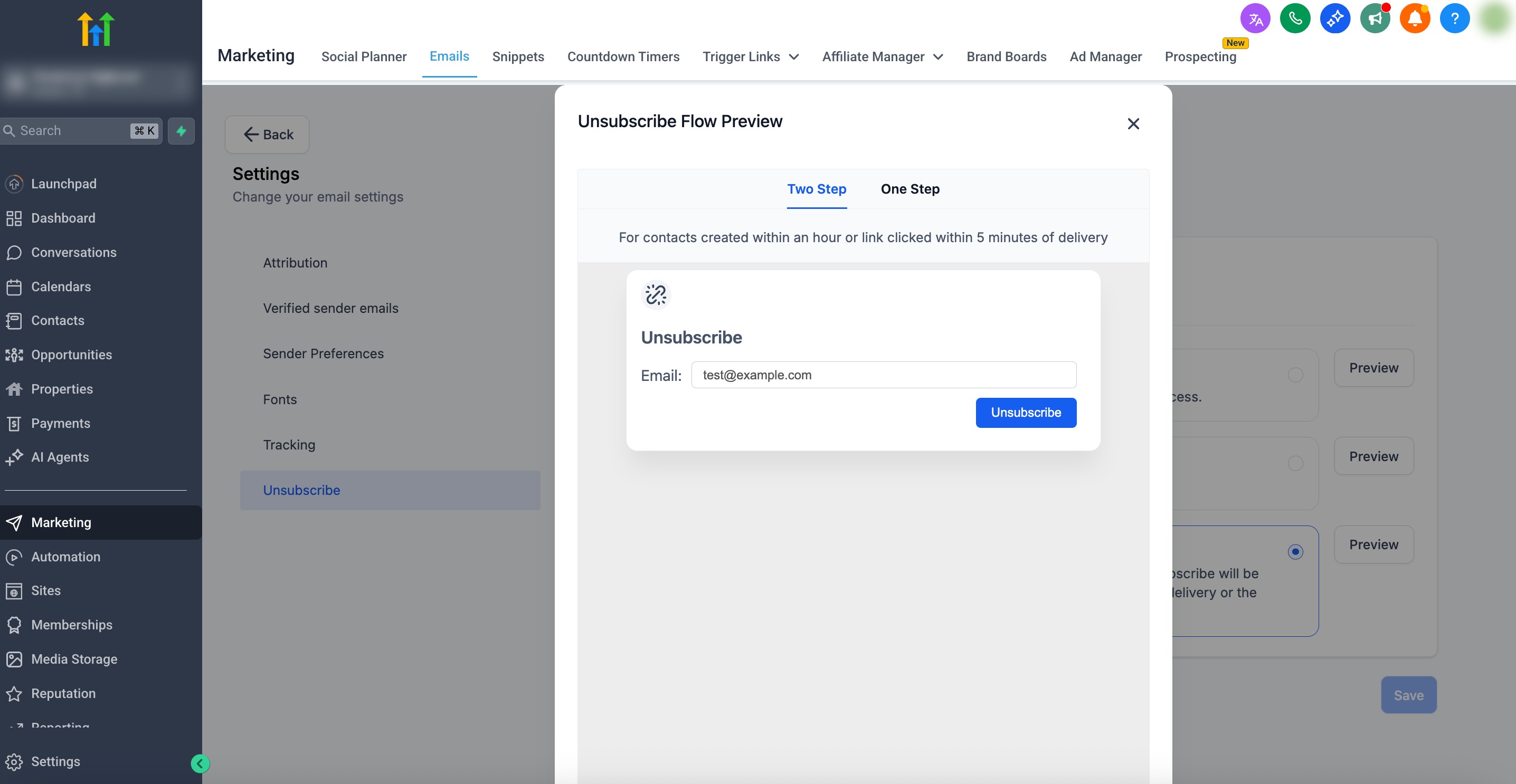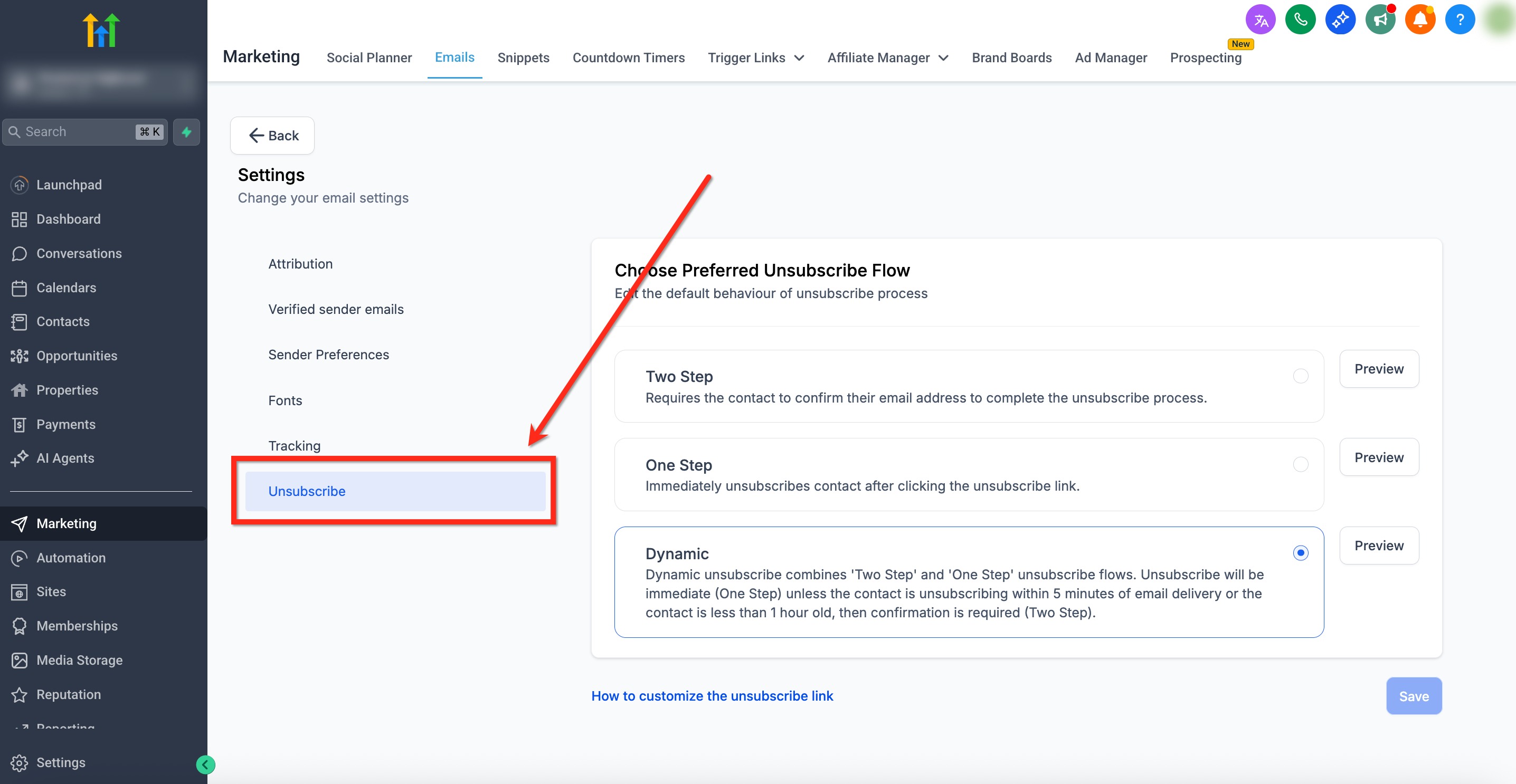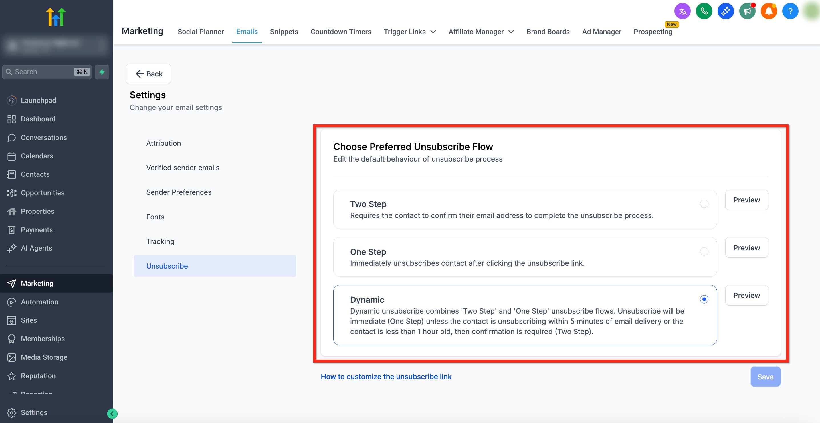 Unsubscribe flows define what happens after a recipient clicks an unsubscribe link in your emails. In HighLevel, you can choose between One Step, Two Step, and Dynamic options to reduce accidental opt‑outs, protect against automated bot clicks, and keep your program compliant while maintaining a smooth experience.