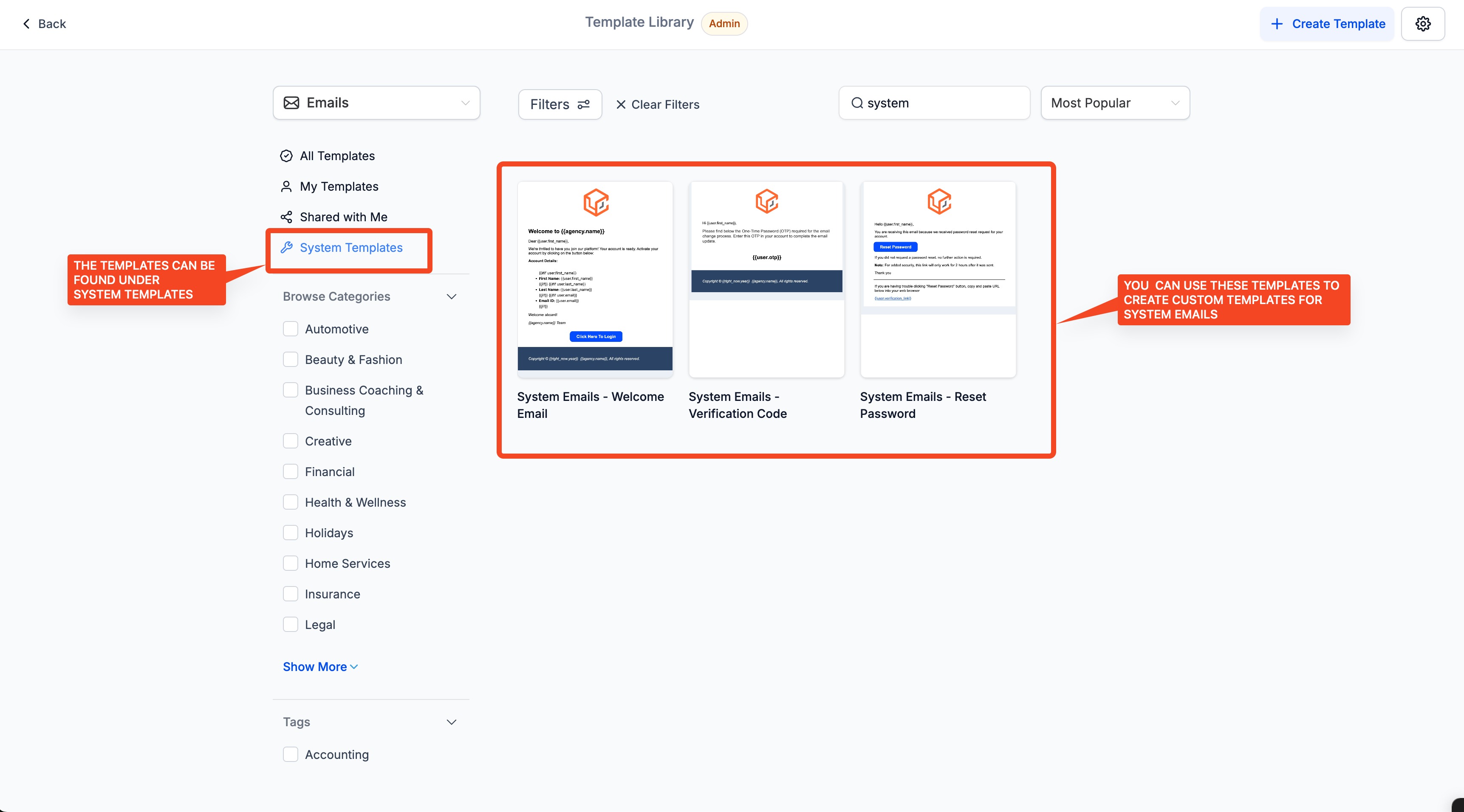 - Click on Create New Template with Email Marketing templates and click on system templates