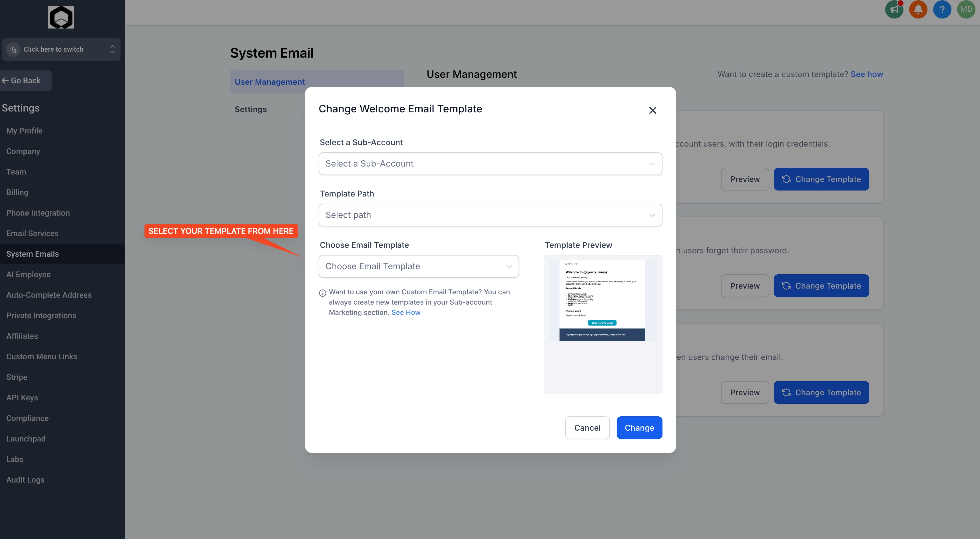 - Click on "Change Template" next to the email you want to edit.