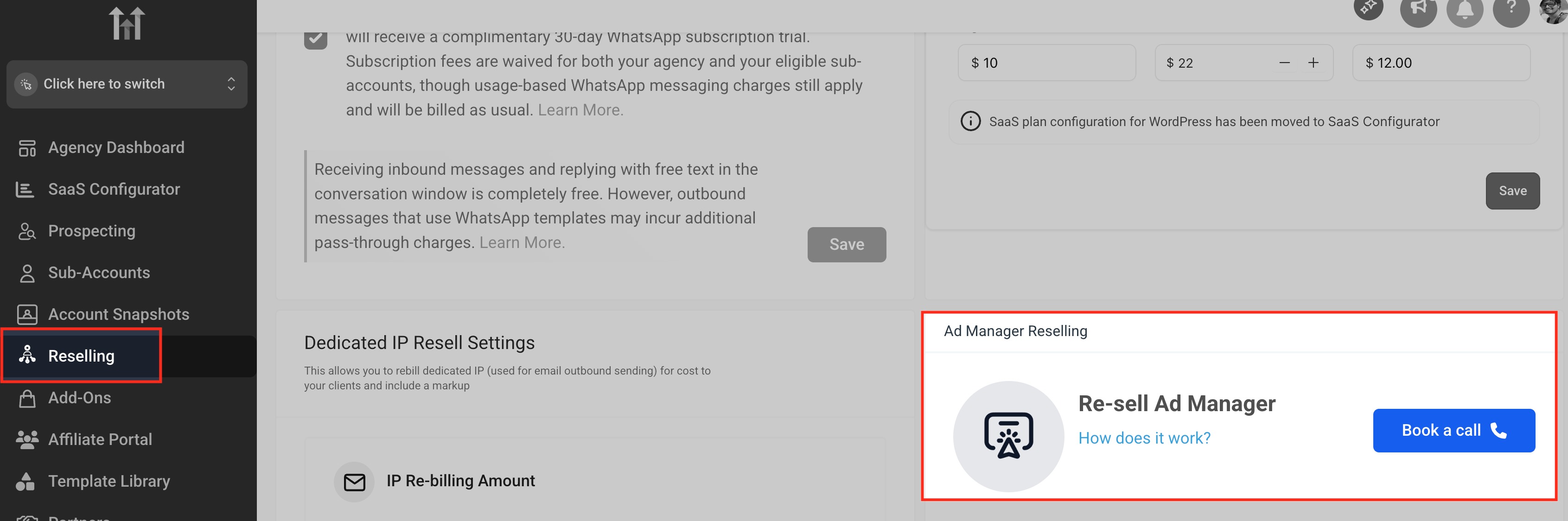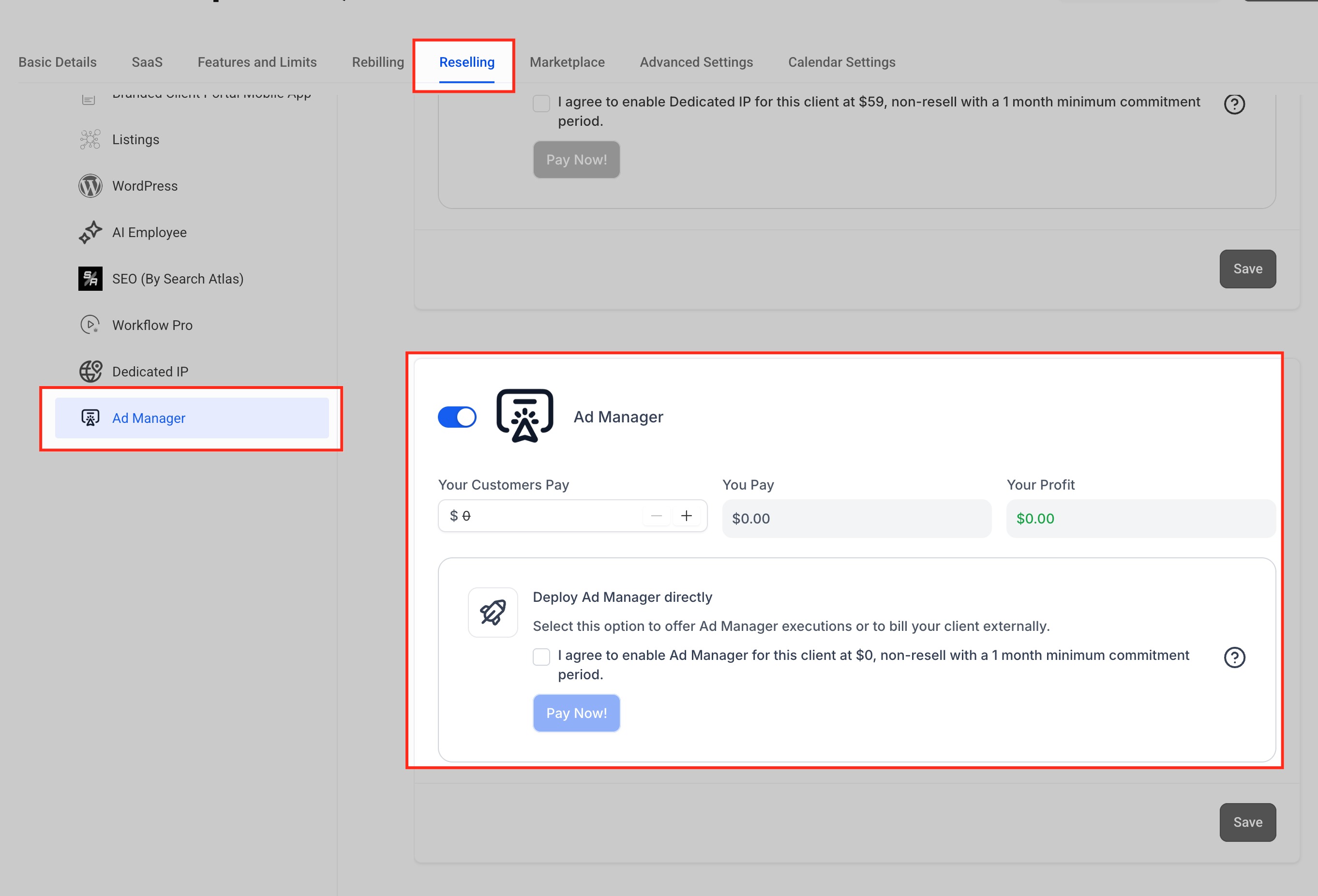 - Agency → Reselling Tab – Define default pricing for all sub-accounts.