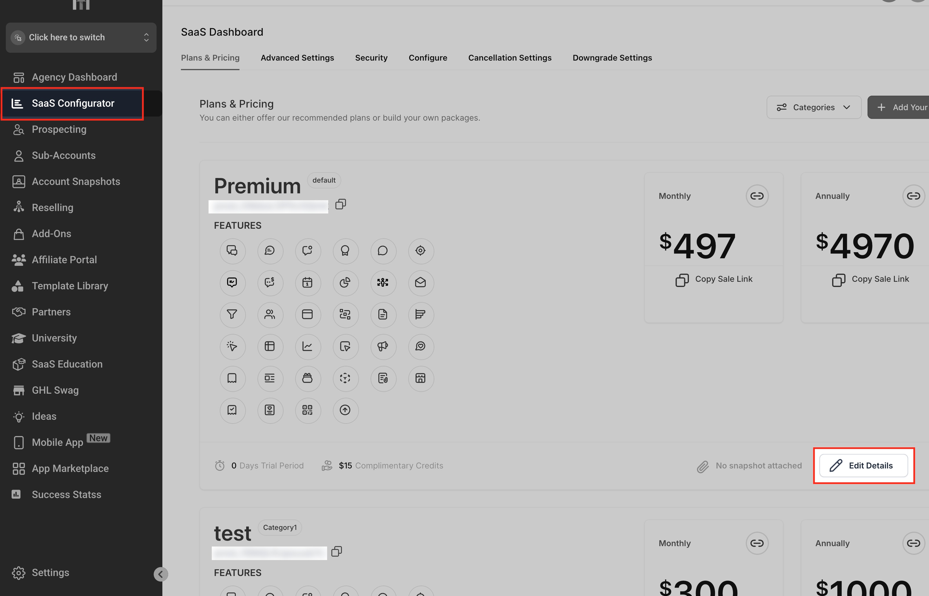 Yes. Agencies can define pricing in the Reselling tab, Sub-Account Reselling tab, or SaaS Configurator.