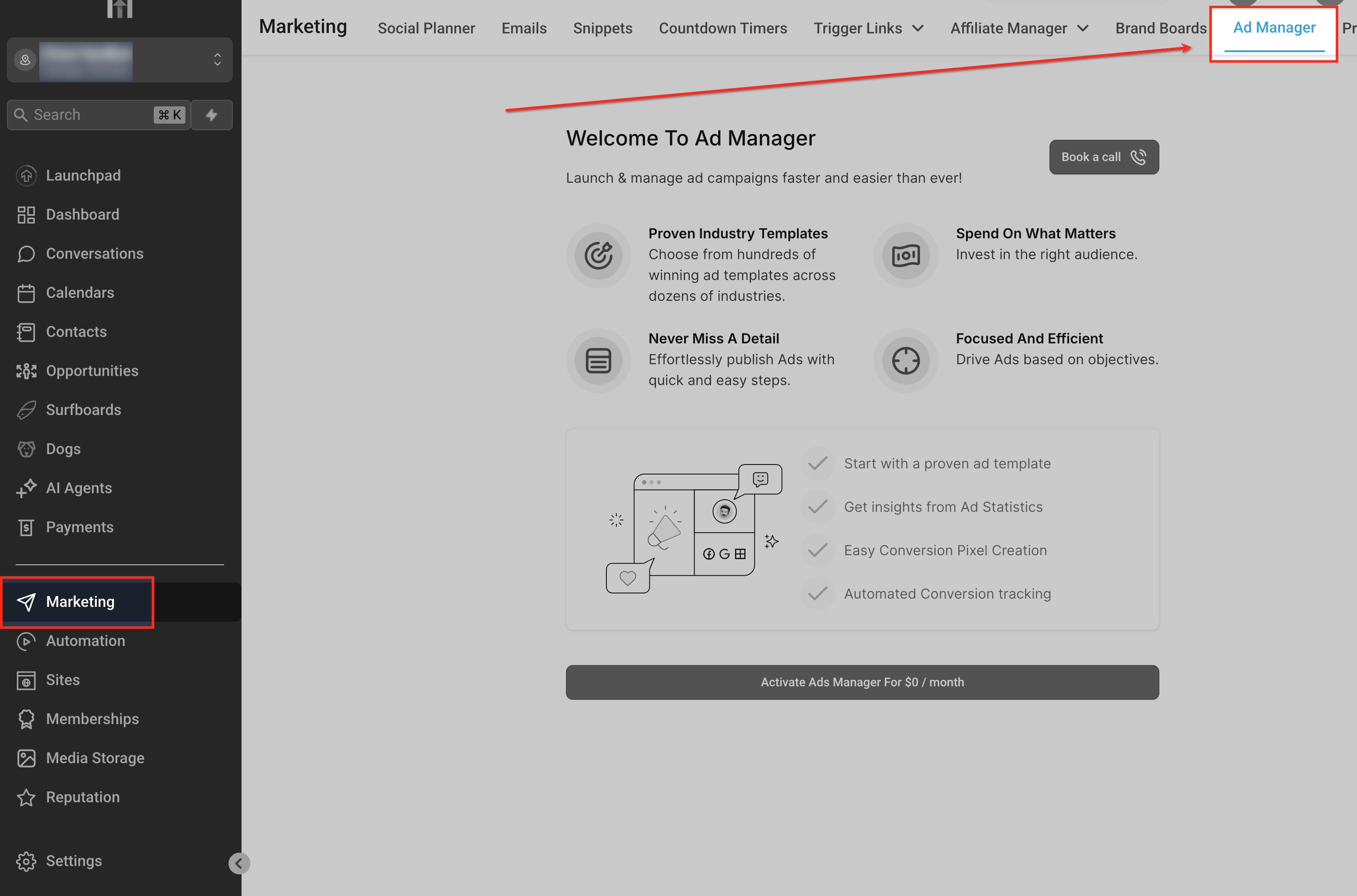 From your HighLevel dashboard, navigate to Marketing → Ad Manager.