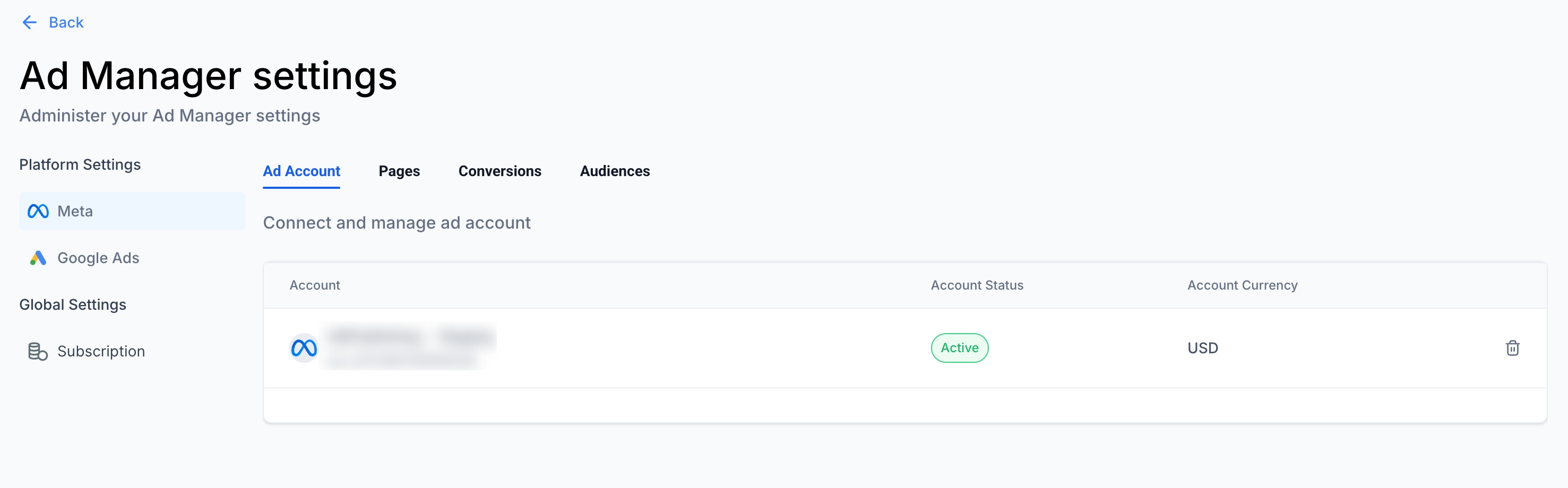 - Displays connected Meta Ad Account with name, account ID, status, and currency.