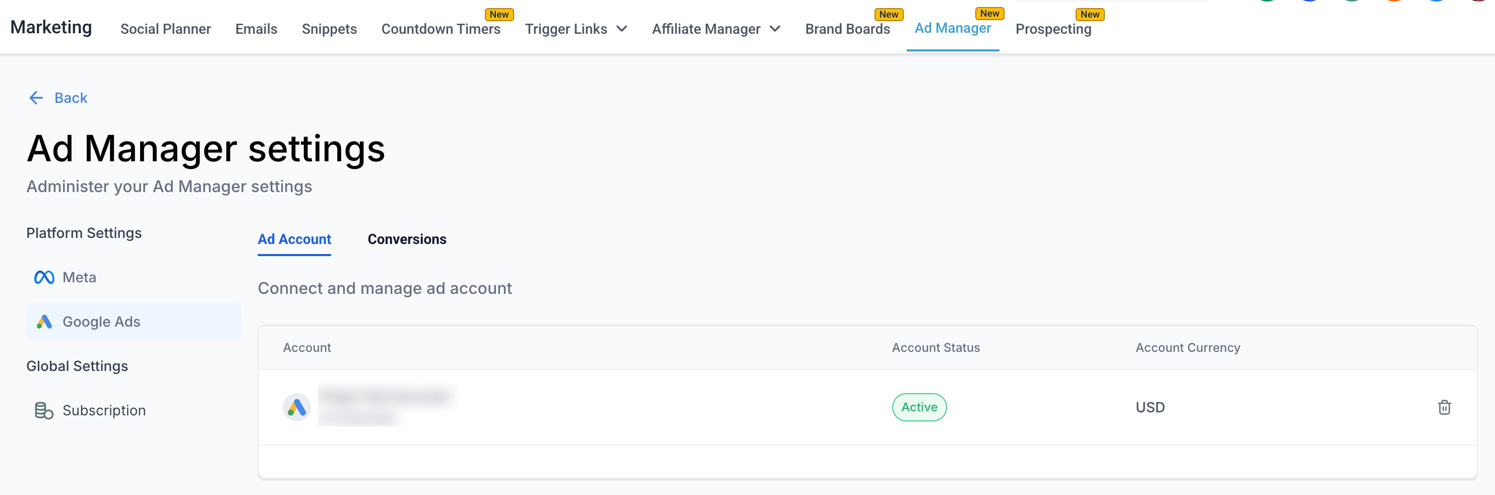 - Displays connected Google Ad Account with name, account ID, status, and currency.