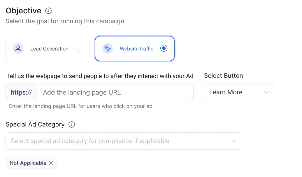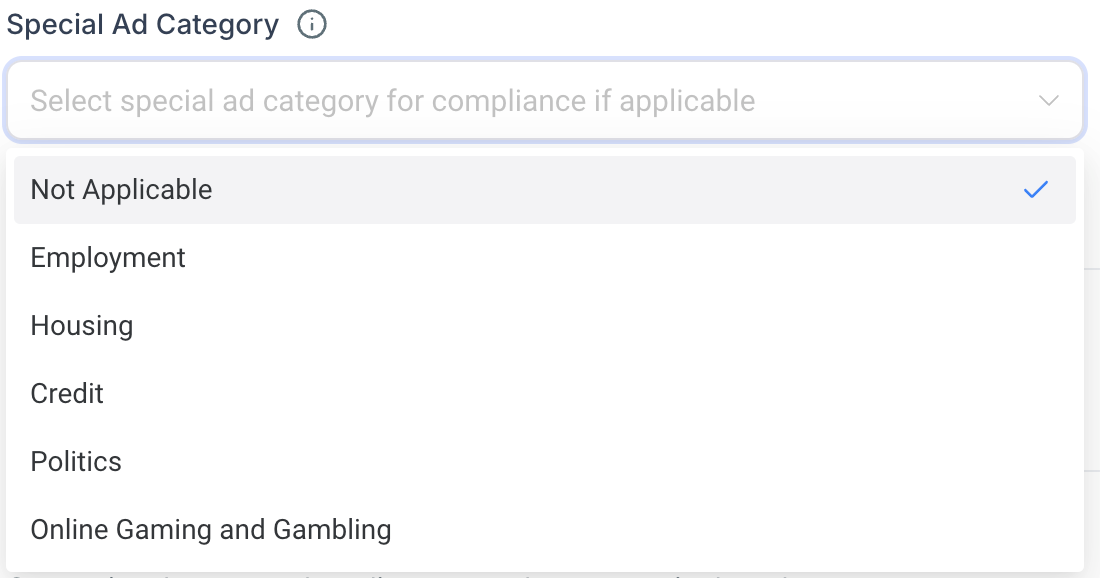 Note - If you are running an ad campaign for employment, housing, online gaming and gambling, credit and politics; it falls under special ad category, ensure to select the appropriate category from the list to comply with local laws and regulations for smooth campaign review.