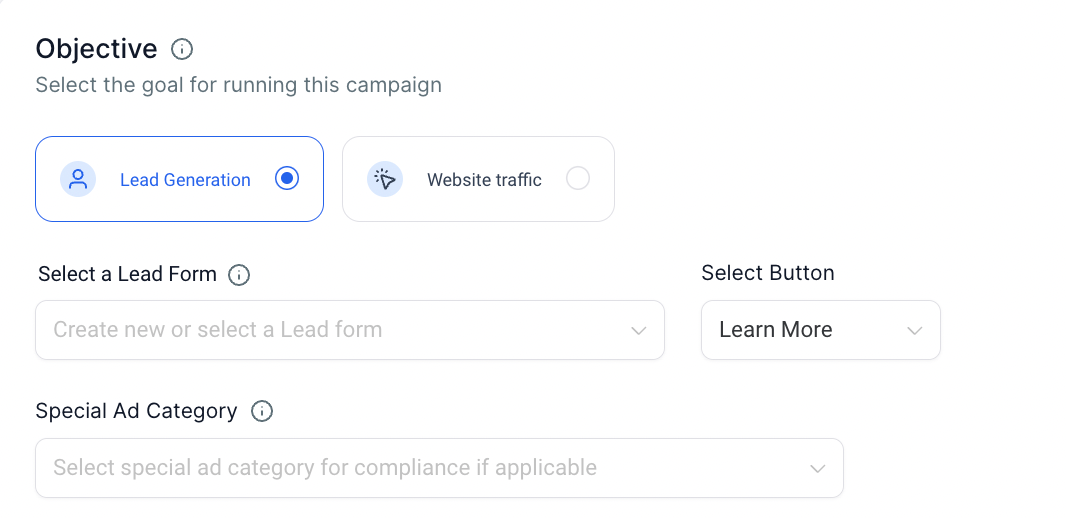 1. Objective - The first step to building a Facebook Ads campaign is to choose a goal that's most important for your business/brand building. Depending on the goal you choose - Lead Generation or Website Traffic.