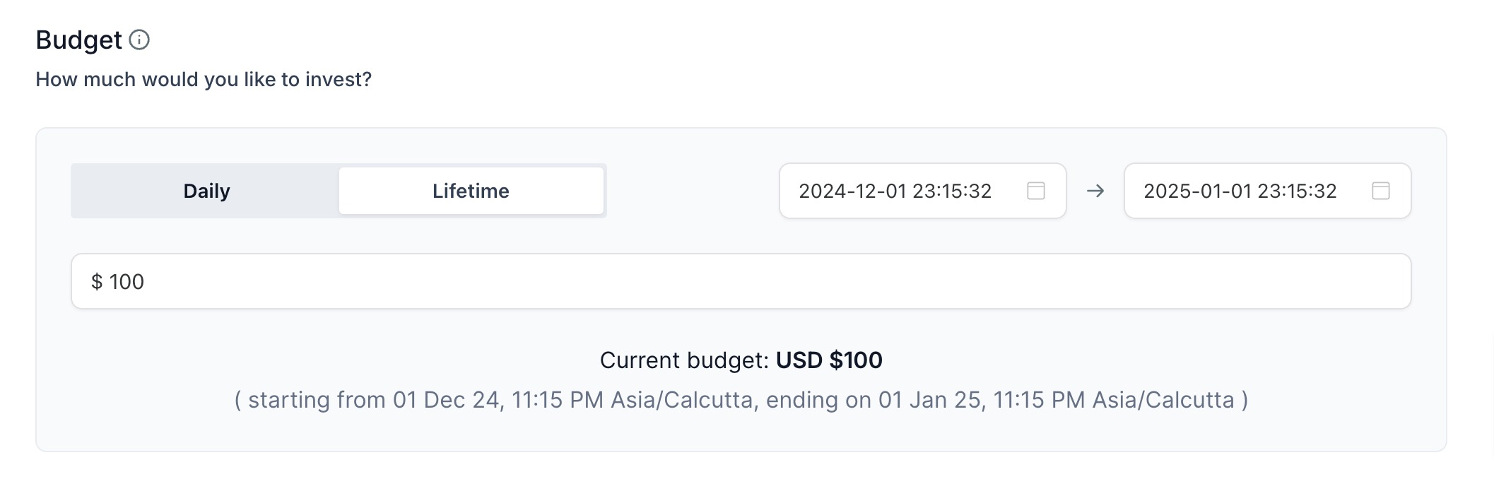 Note: The currency shown will be the one that's setup in your connected Ad account and the start-end date timezone will be the timezone you're in while creating the campaign.