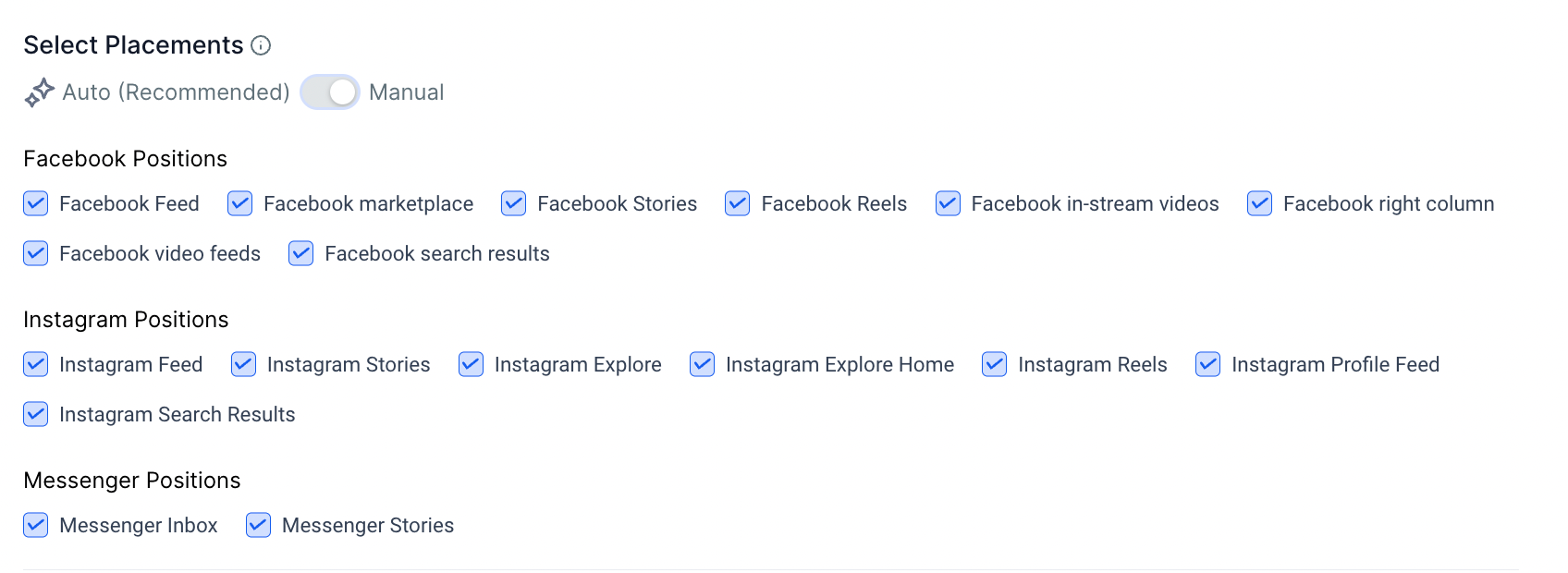 2. Placement - The places where you can run your ads are called placements. Automatic placements enable us to get the best results available from across all default placements based on budget allocated and help control costs. Manual placements allows user to select the places where they would like to show the ads for brand safety and optimisation.