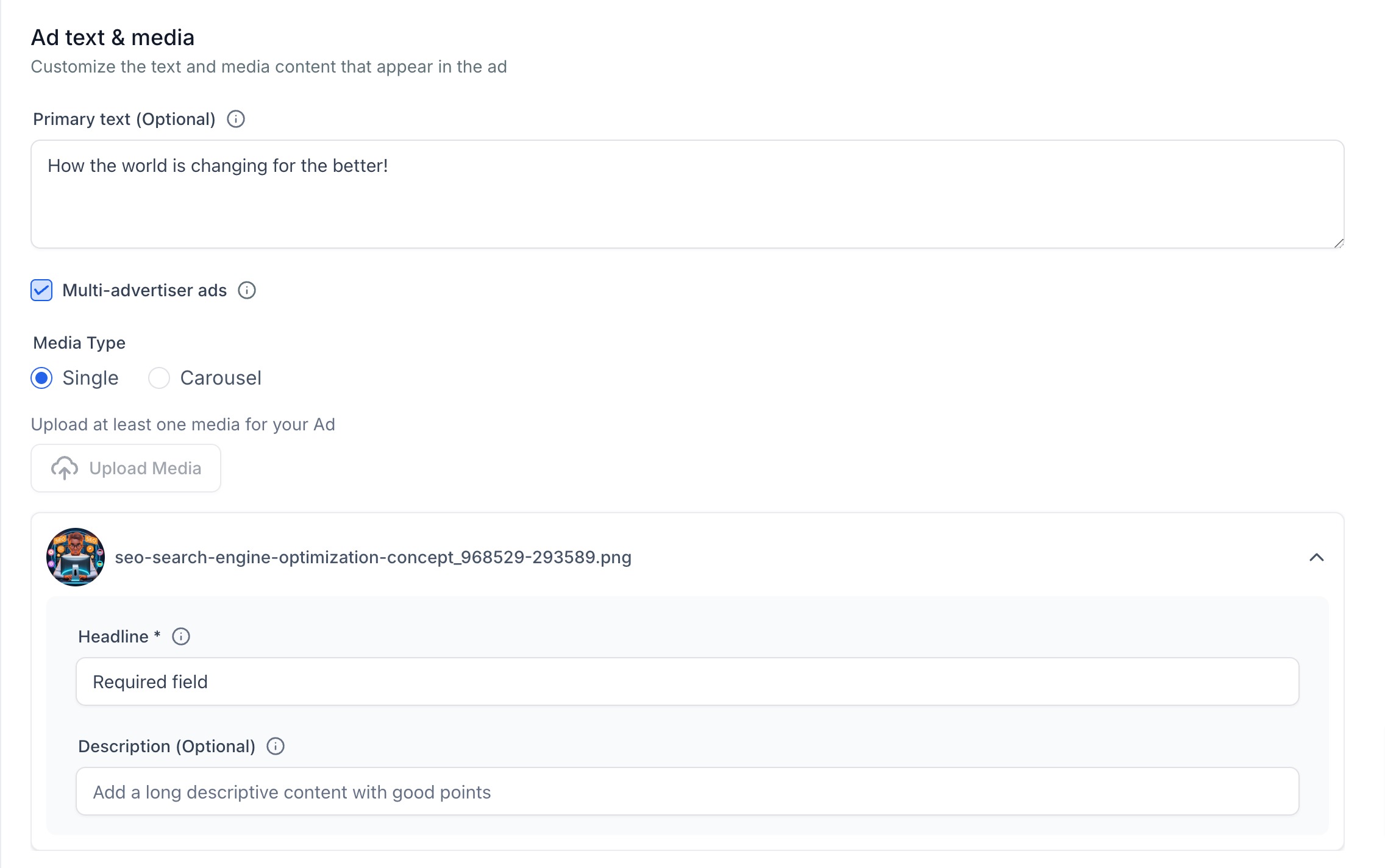 3. Ad Content - It will allow user to add the primary text, headline, description and media like image(s) and video(s) both in single and carousel mode.