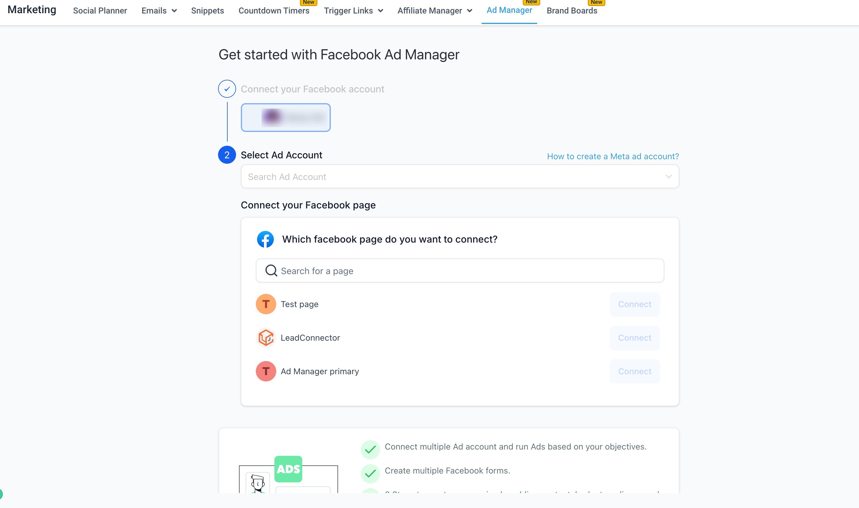 On the Ad Manager home screen, click on the 'Create Campaign' button and from the following screen select the platform to publish your ad campaign, i.e. Facebook.
