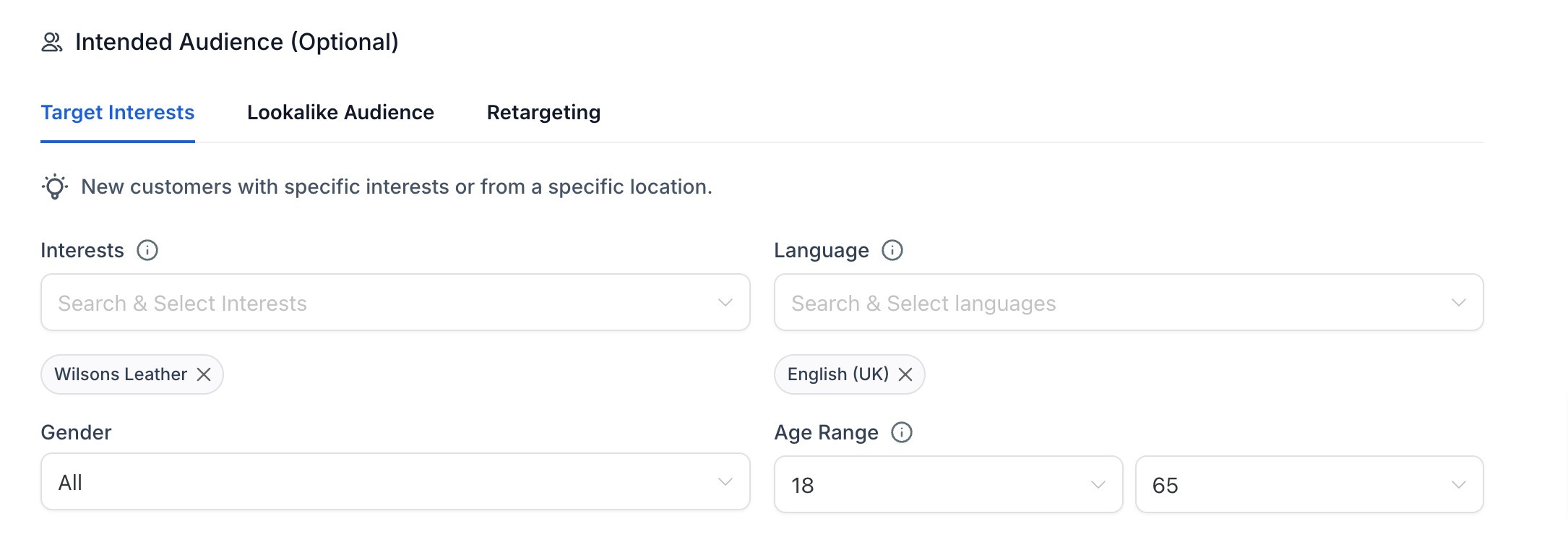 - Optional Settings of Intended Audience can be defined to narrow down the audience - The user can add more specific setup for each option.