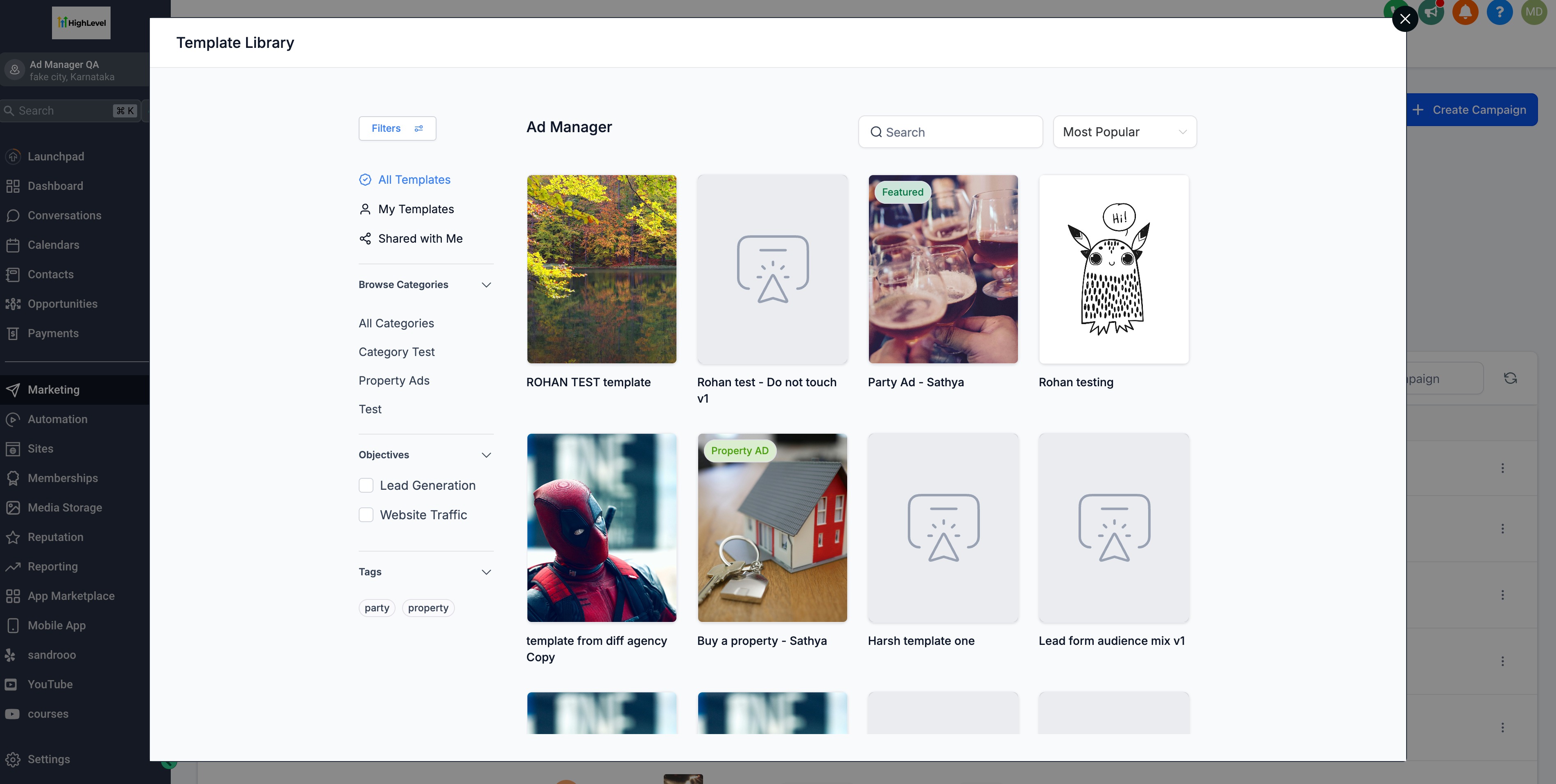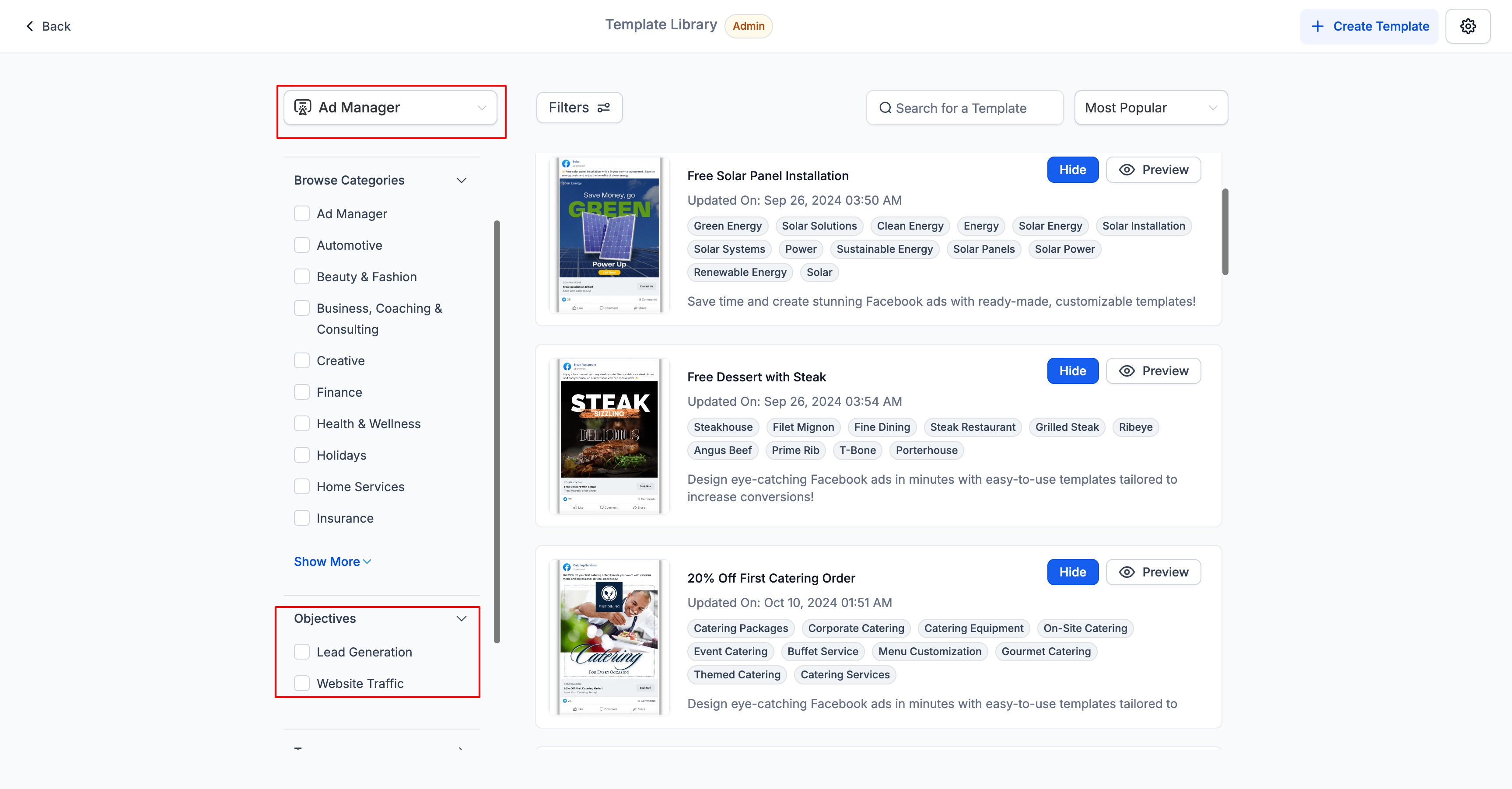 In agency view, under Template Library section, an Ad Manager tab is added to see all the templates specific to ad manager. Users can filter the templates based on ad campaign objectives, i.e. Lead Generation and Website Traffic. Going forward as and when new objectives will be added to the campaign creation flow, the same will be shown as filters in Template Library.