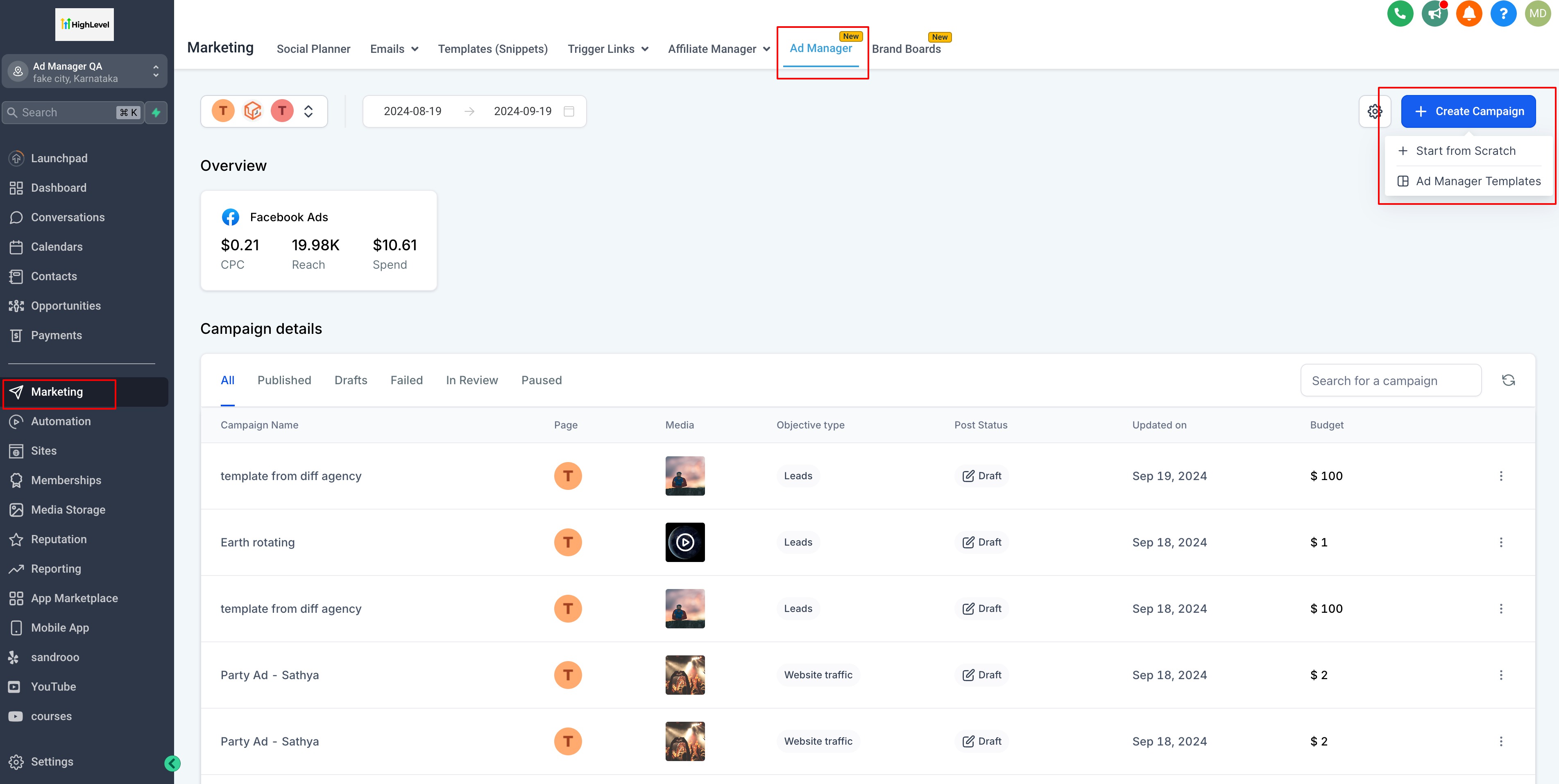 - In Ad Manager home screen, the existing "Create Campaign" button is made a dropdown with two options: 'Start from Scratch' and 'Ad Manager Templates'.