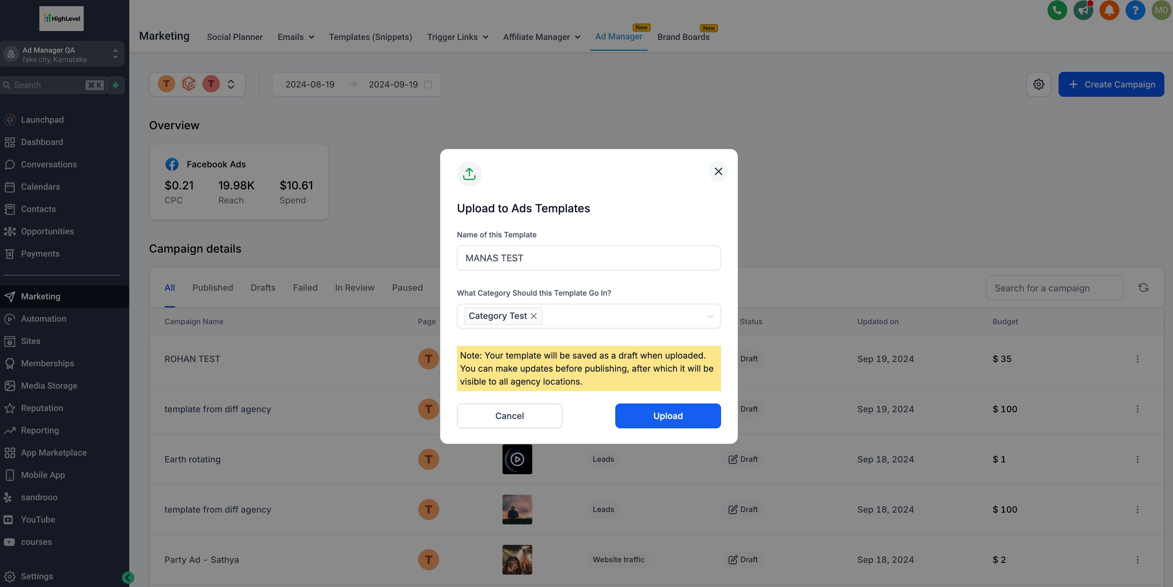 - Click on 'Upload' and the campaign will be saved as a draft template.