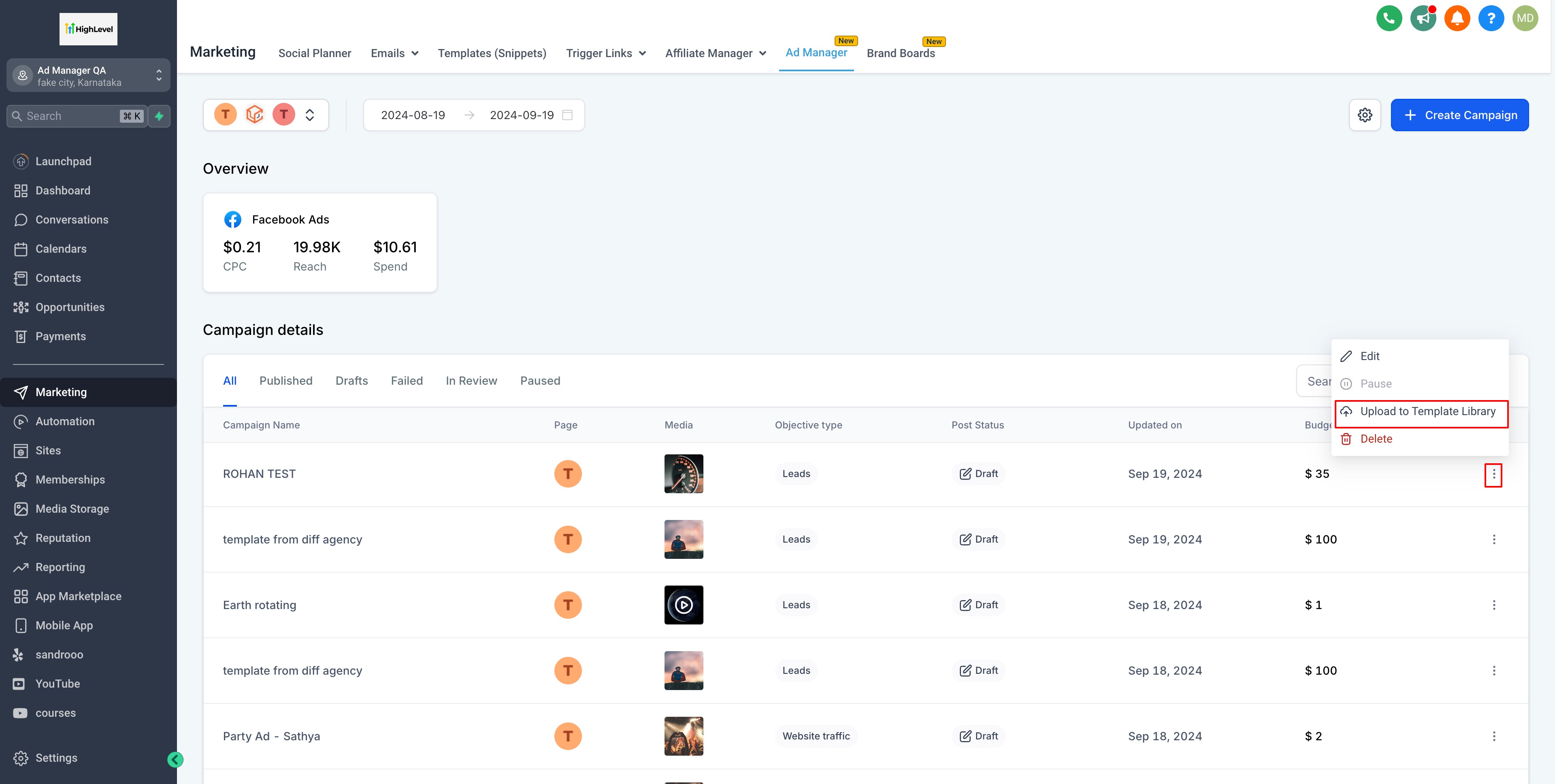 - Out of the list of existing campaigns, user can choose to select any of the campaign to be used as a template by clicking on the ellipses of that campaign and select 'Upload to Template Library'.