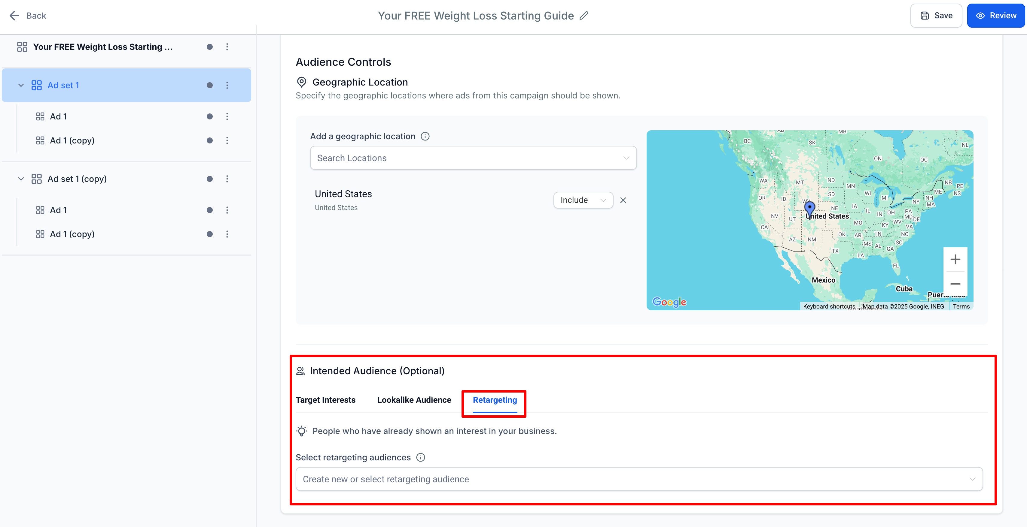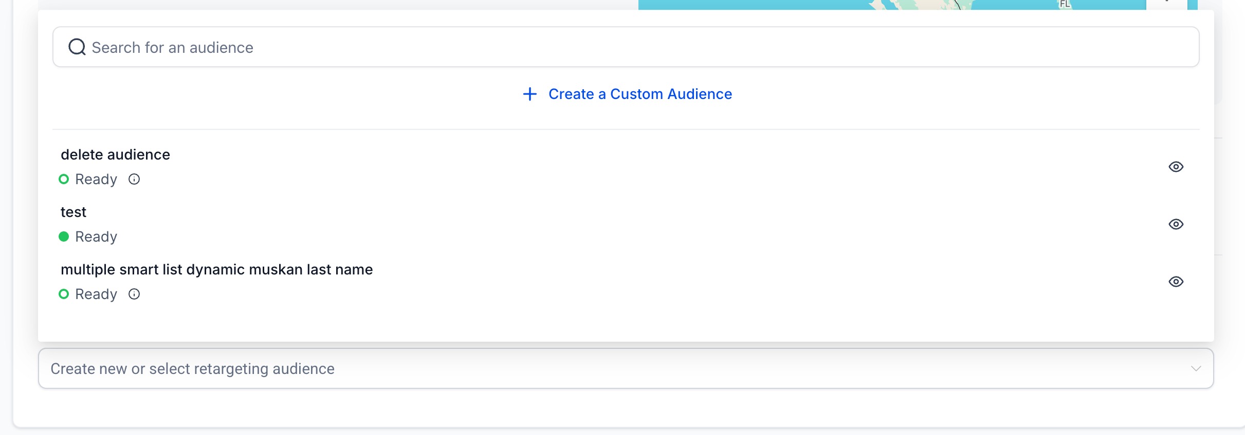 Once created and ready, the audience appears in the Retargeting Audience dropdown and in the Audiences tab.