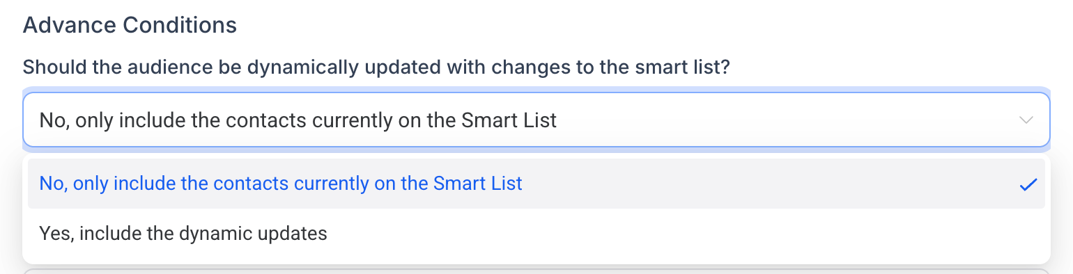 Choose one or more Smart Lists from the dropdown (only pre-created lists from the Contacts section are available).