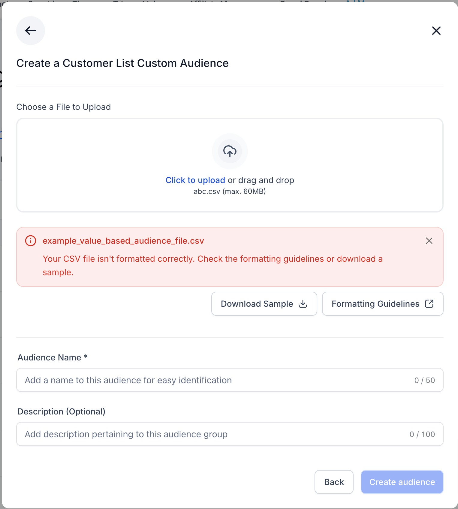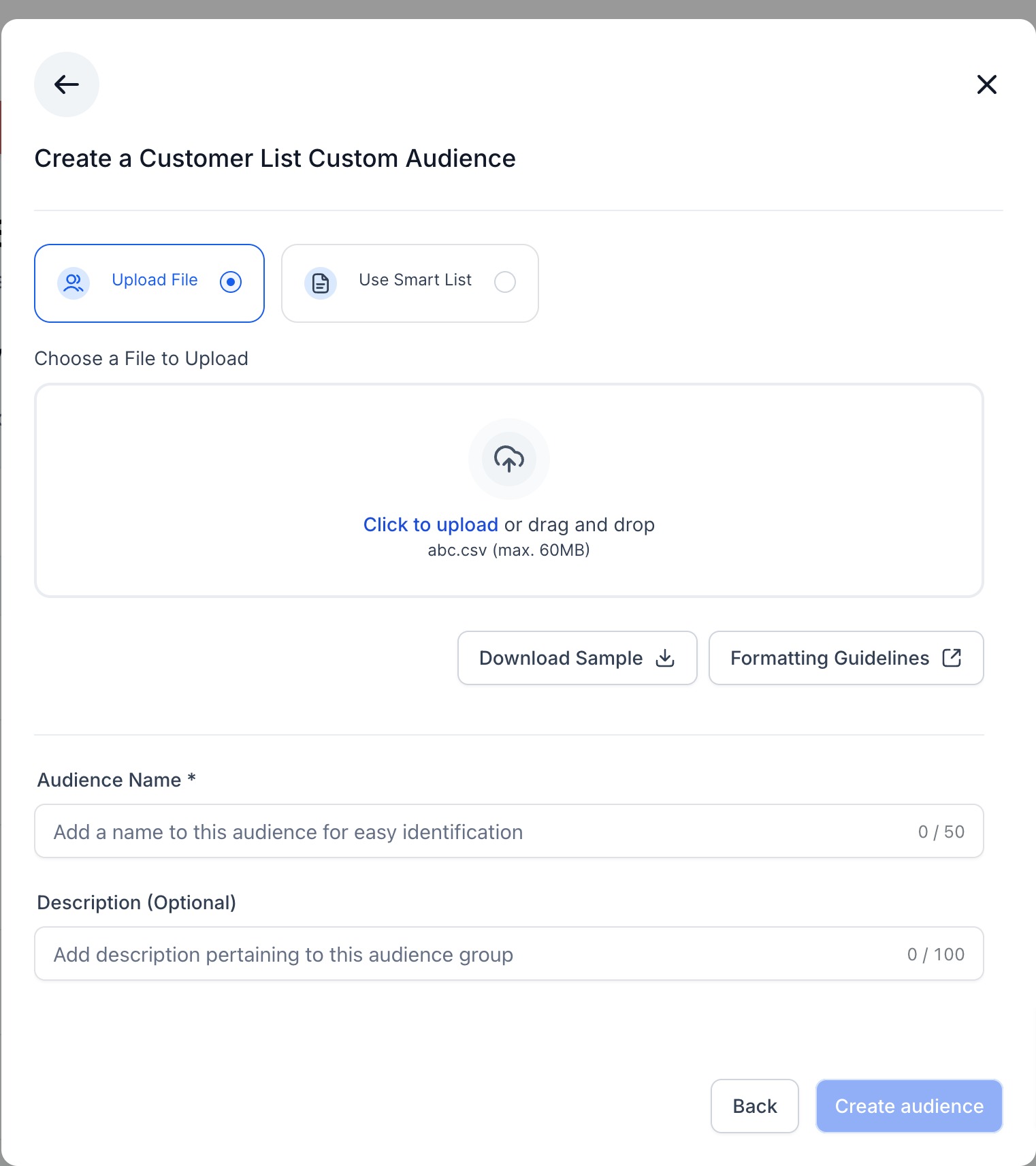 Click Create a Custom Audience (in the campaign flow or from the Audiences tab).