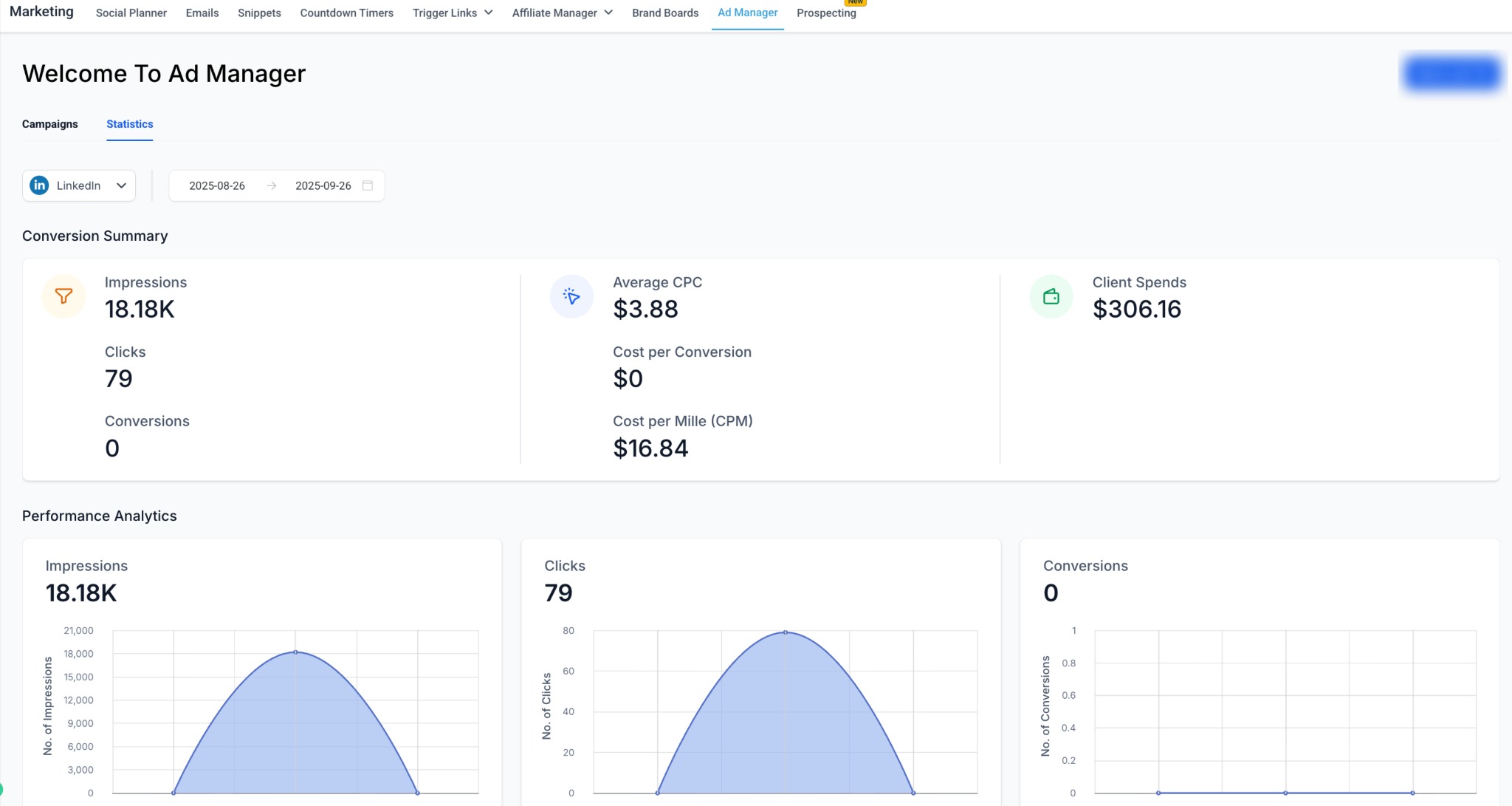 HighLevel Ad Manager provides an integrated dashboard for tracking your LinkedIn ad performance alongside Meta and Google campaigns. With LinkedIn Statistics, you can monitor results at every level, from overall campaign groups to individual ads.
