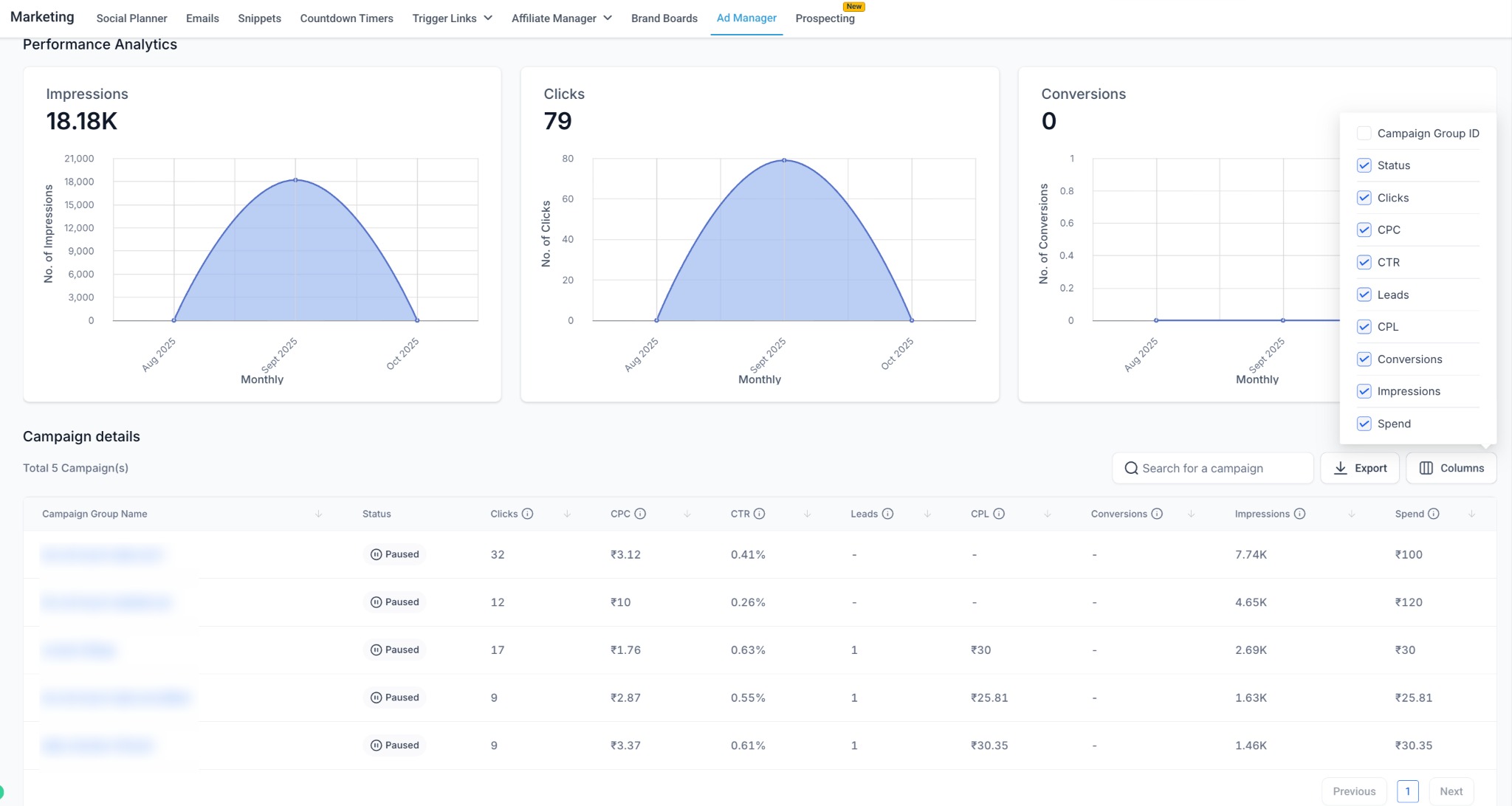 Other metrics: Status, Spend, Impressions, Clicks, CTR, CPC, CPM.