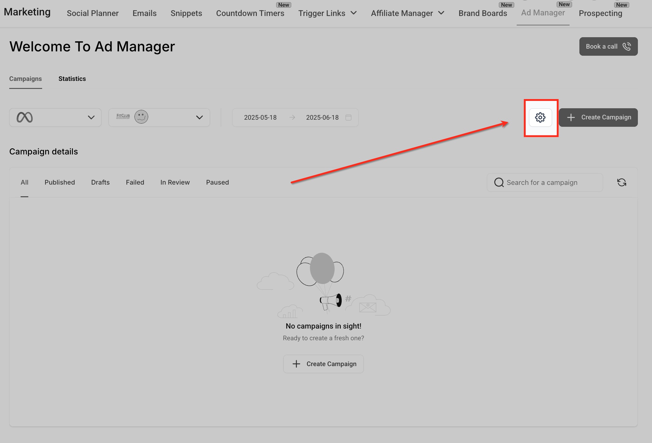 In the Ad Manager dashboard, click the gear icon located next to the “Create Campaign” button. This opens the Ad Manager settings where you can configure conversion tracking and platform preferences.