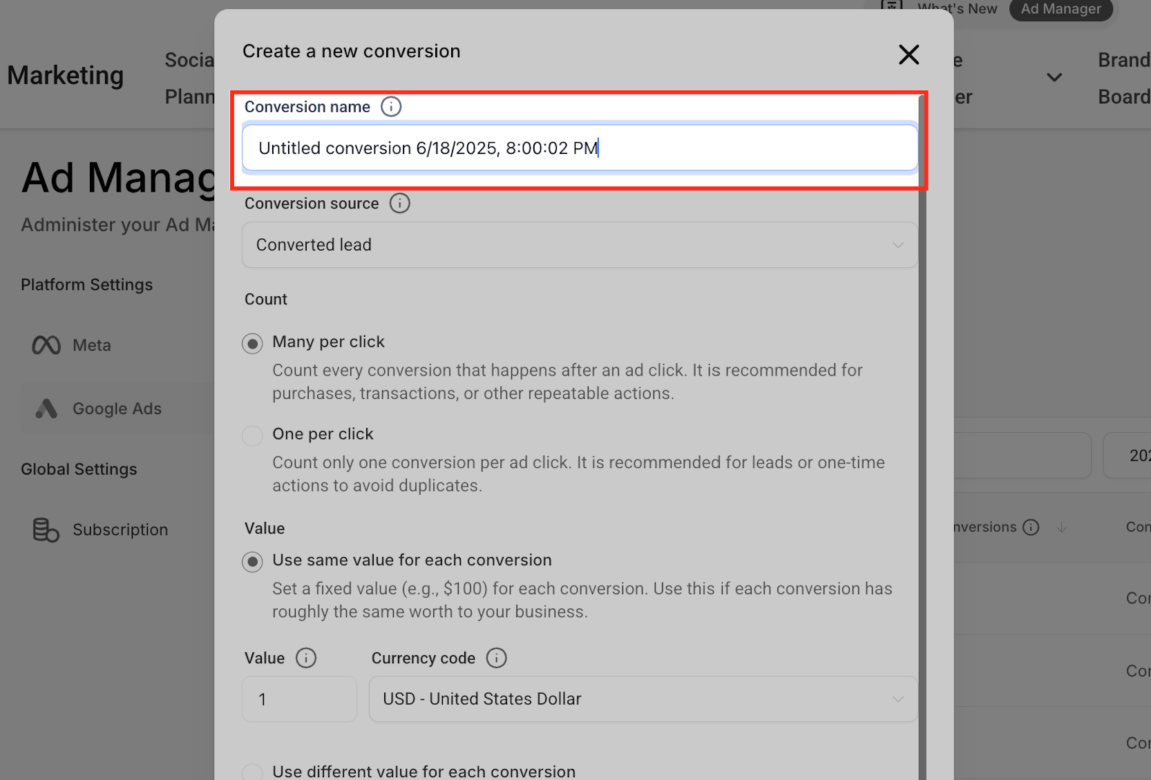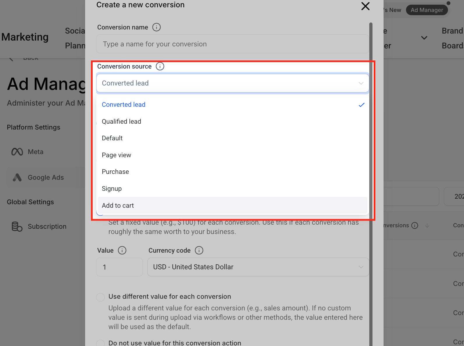 Select a relevant conversion source from the dropdown menu. Options include Converted lead, Qualified lead, Purchase, Signup, and more. Choose the one that best matches the action you’re tracking.