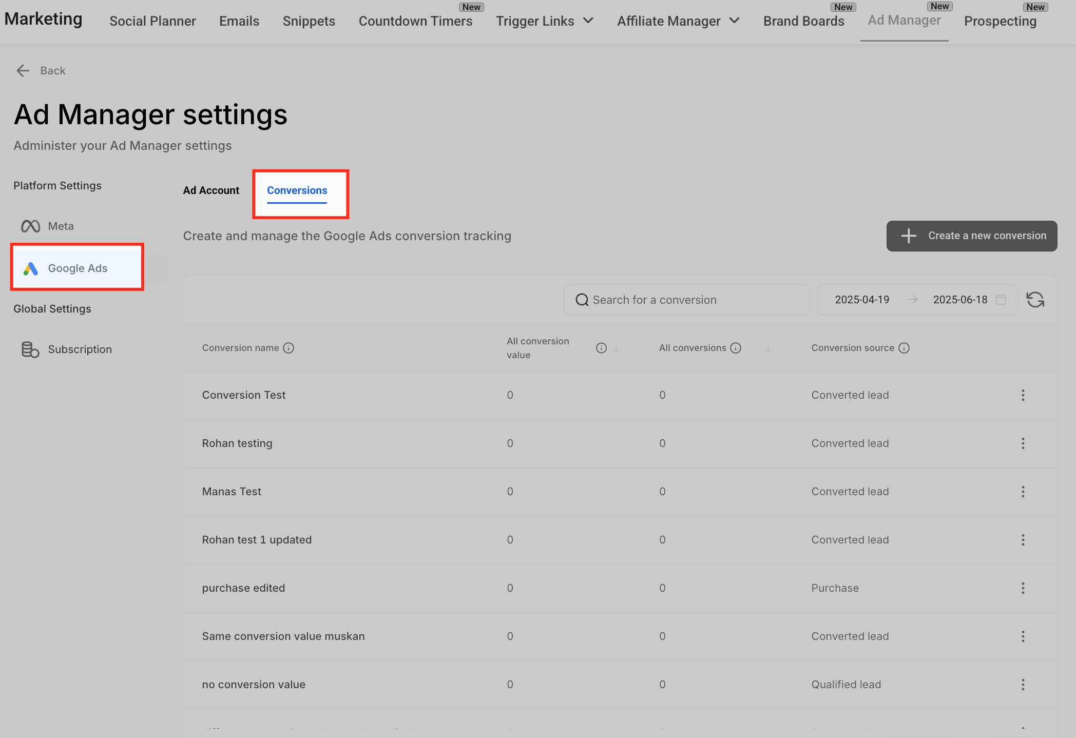 Yes. You can manage both existing and newly created conversion actions directly within the HighLevel Ad Manager.