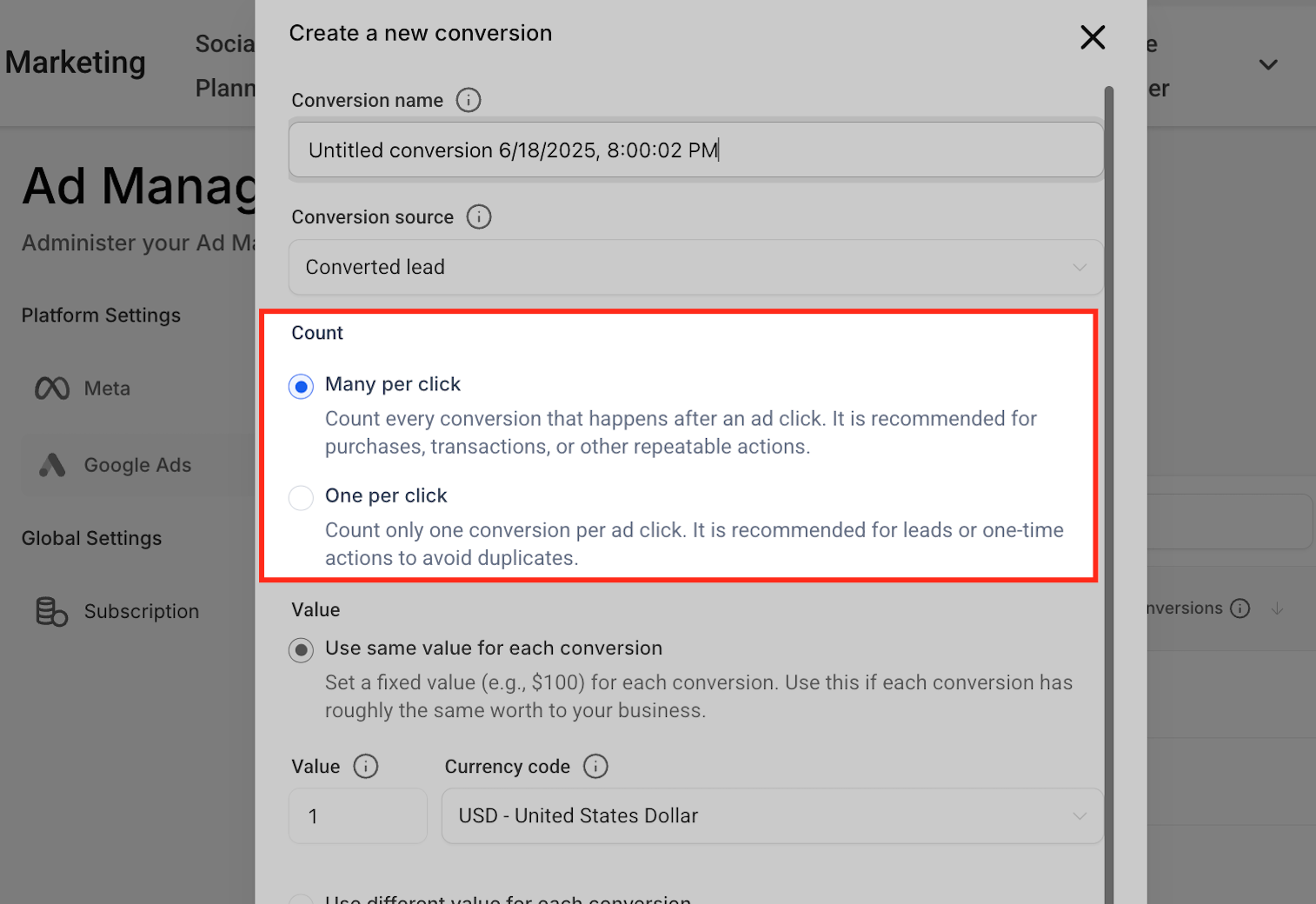 Choose how conversions are counted per ad click. Use Many per click for purchases or repeatable actions, or One per click for leads or one-time form submissions to prevent duplicates.