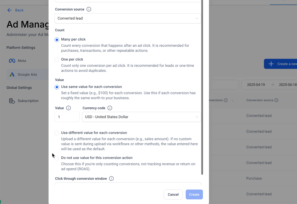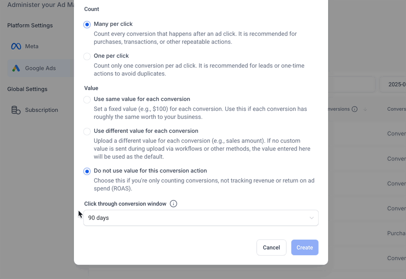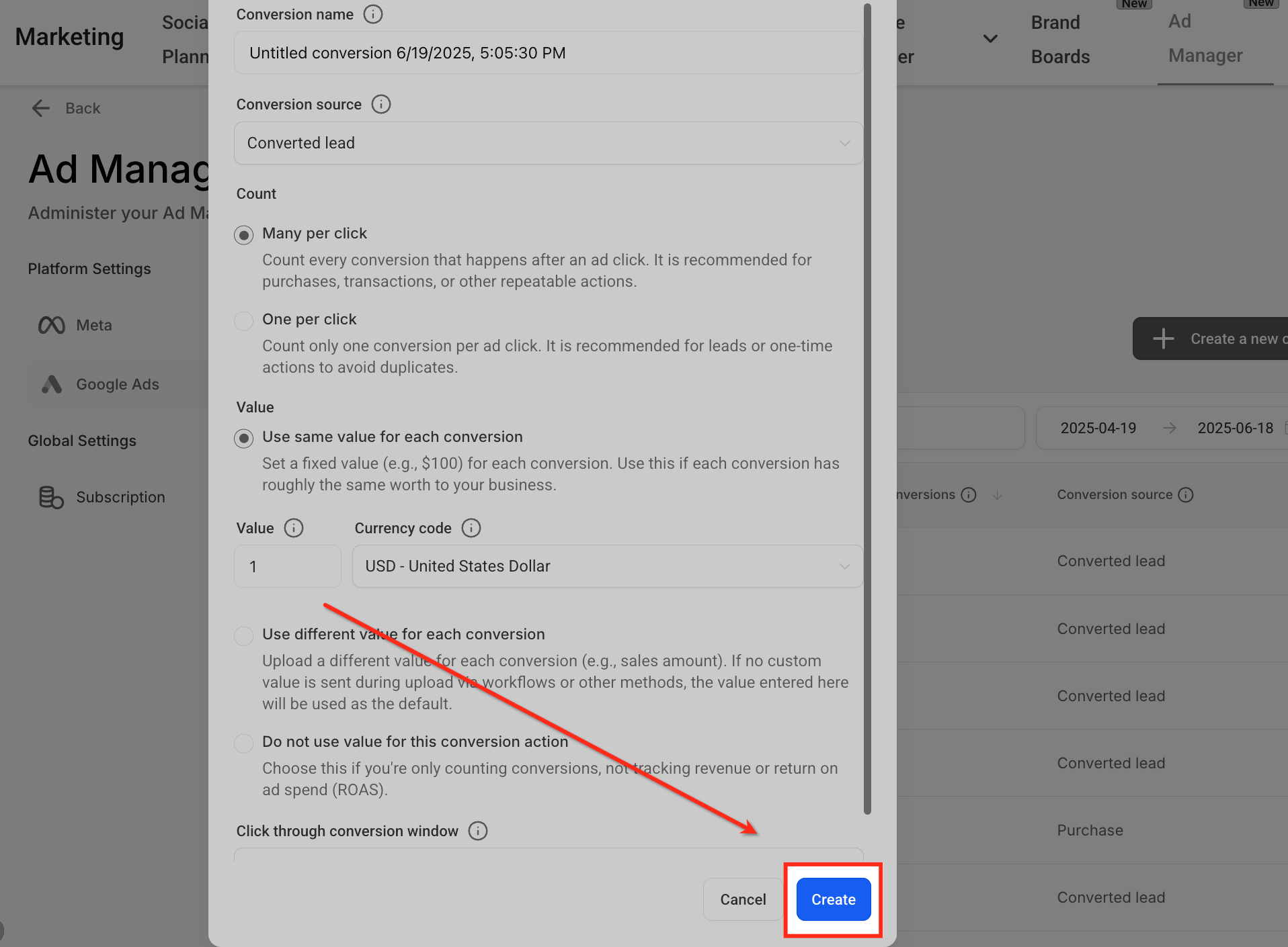Once all fields are filled out, click the Create button to save your new offline conversion action. It will be instantly synced with your connected Google Ads account and available for tracking and reporting.