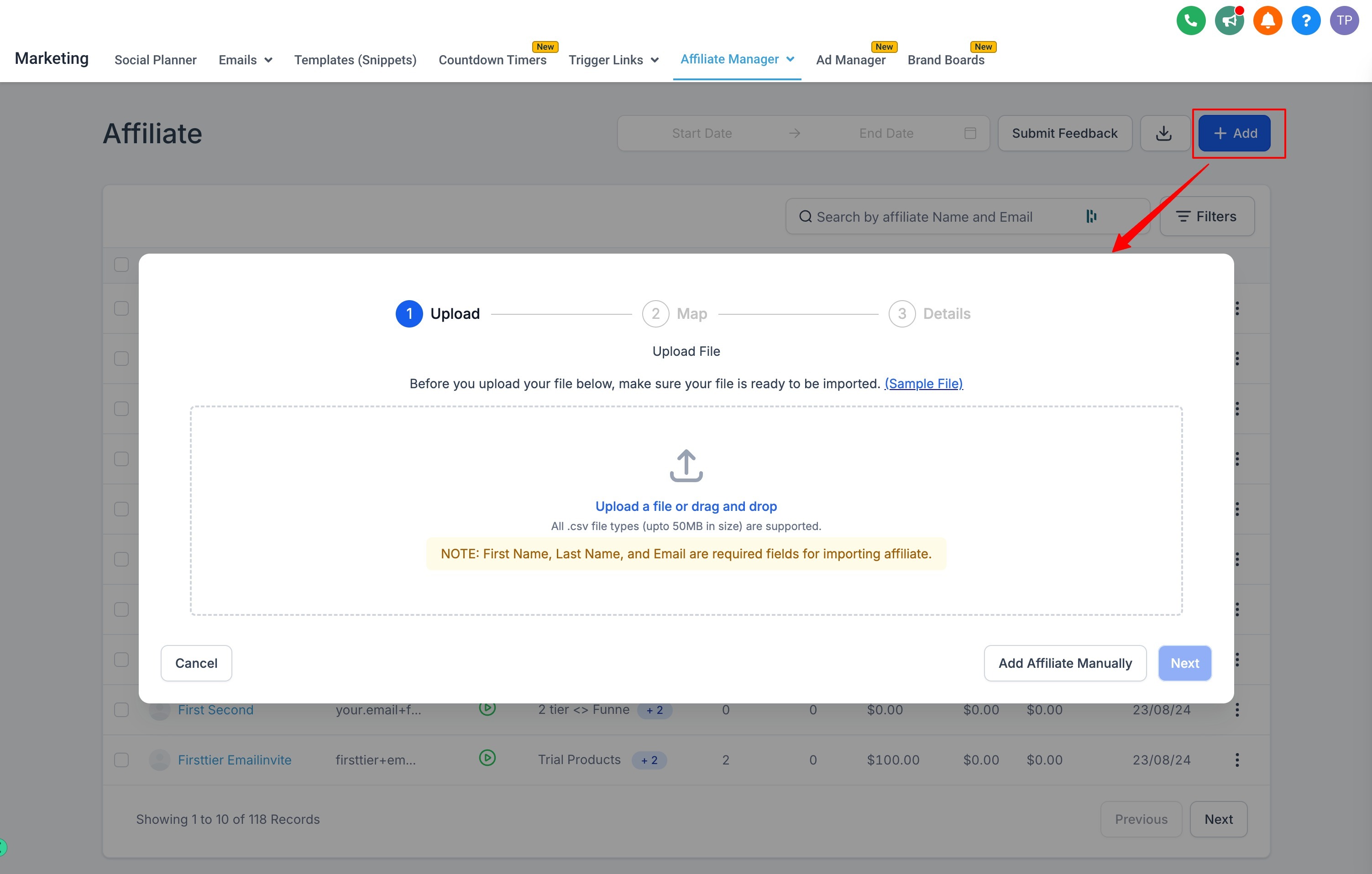 - Upload Your CSV: Go to the Affiliate section and click on "Add" and choose "Upload Affiliate". Make sure the file format matches the sample file (Sample File)