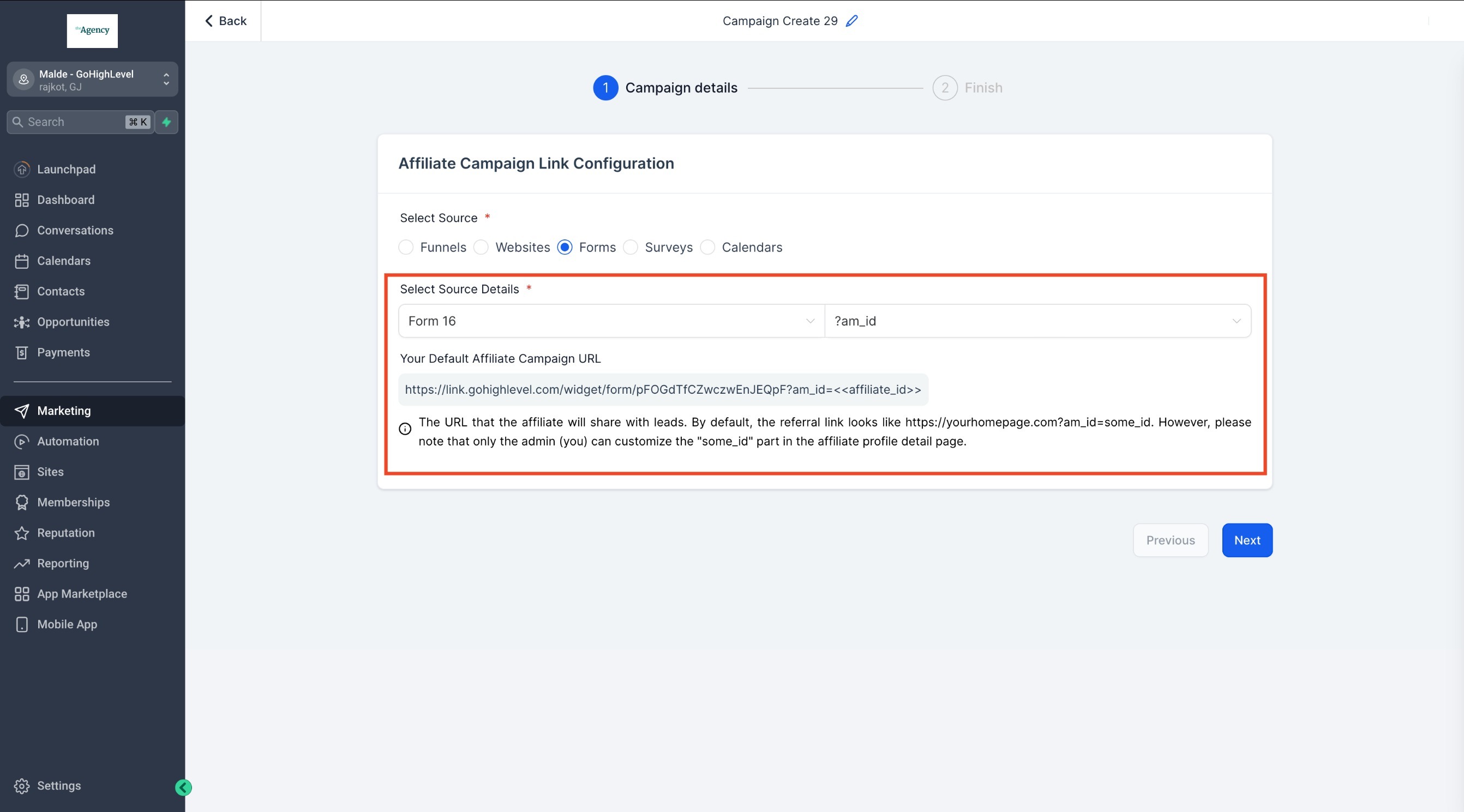 Select Forms, Surveys, or Calendars as the source for your campaign. These sources allow you to track leads generated through your affiliate's efforts seamlessly.