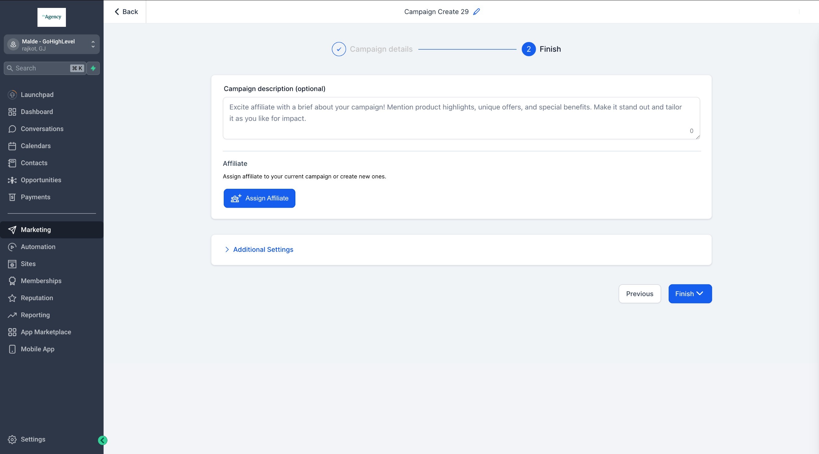 You can further customize the campaign by adding campaign descriptions, assigning affiliates, and adjusting any additional settings as needed.