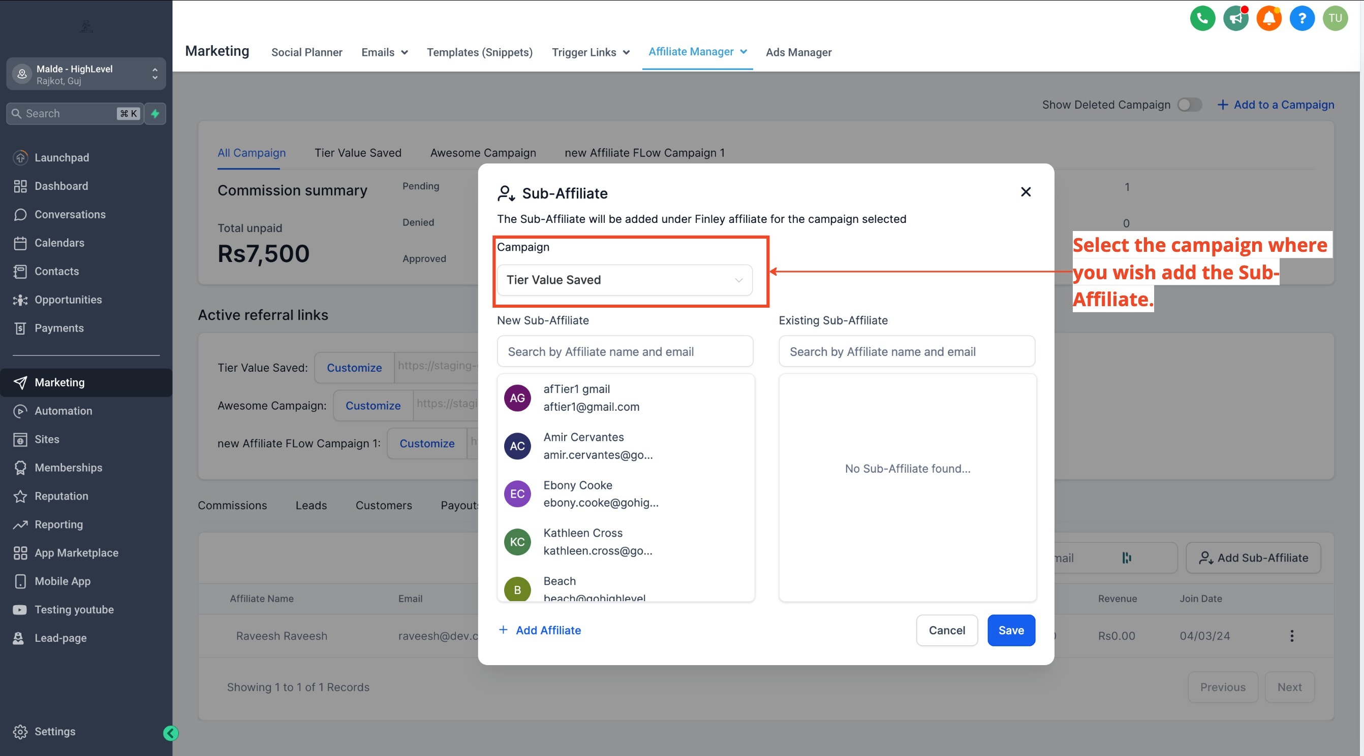 - Select an Affiliate: Click on the affiliate you want to add sub-affiliates under.