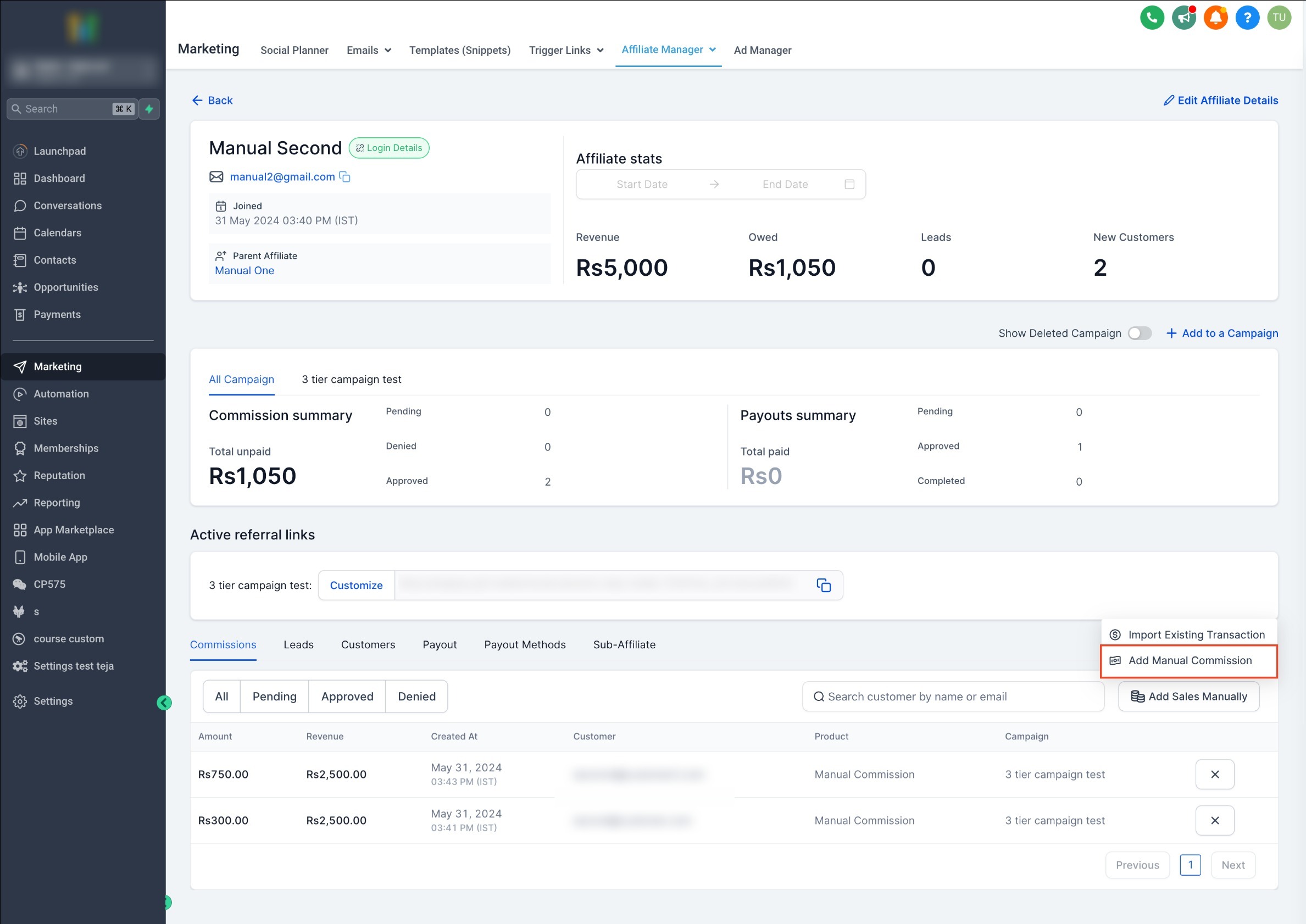 Let’s say you enter a manual sale with a revenue amount of $100, and the default commission rate for the affiliate’s campaign is 20%. In this case, the affiliate will automatically receive a commission of $20 (20% of $100) for that sale.