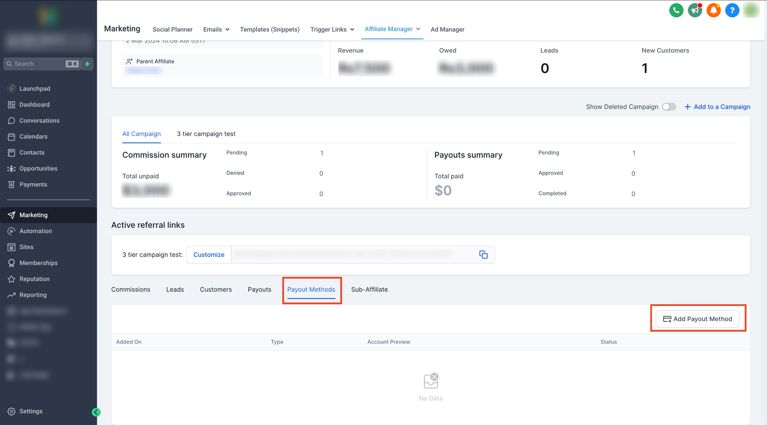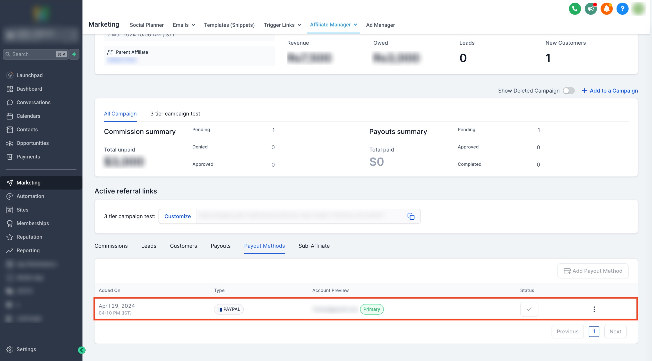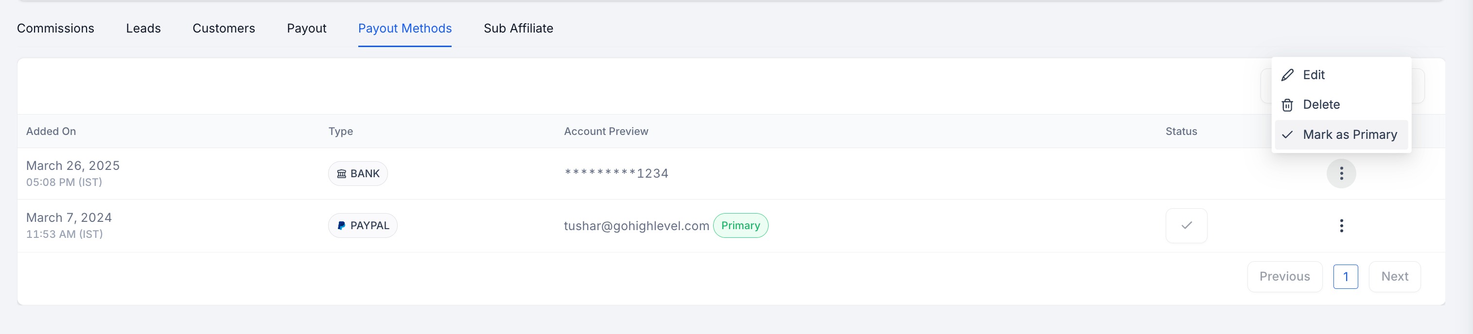 - You can add multiple payout methods for an Affiliate and select one as a primary payout method.