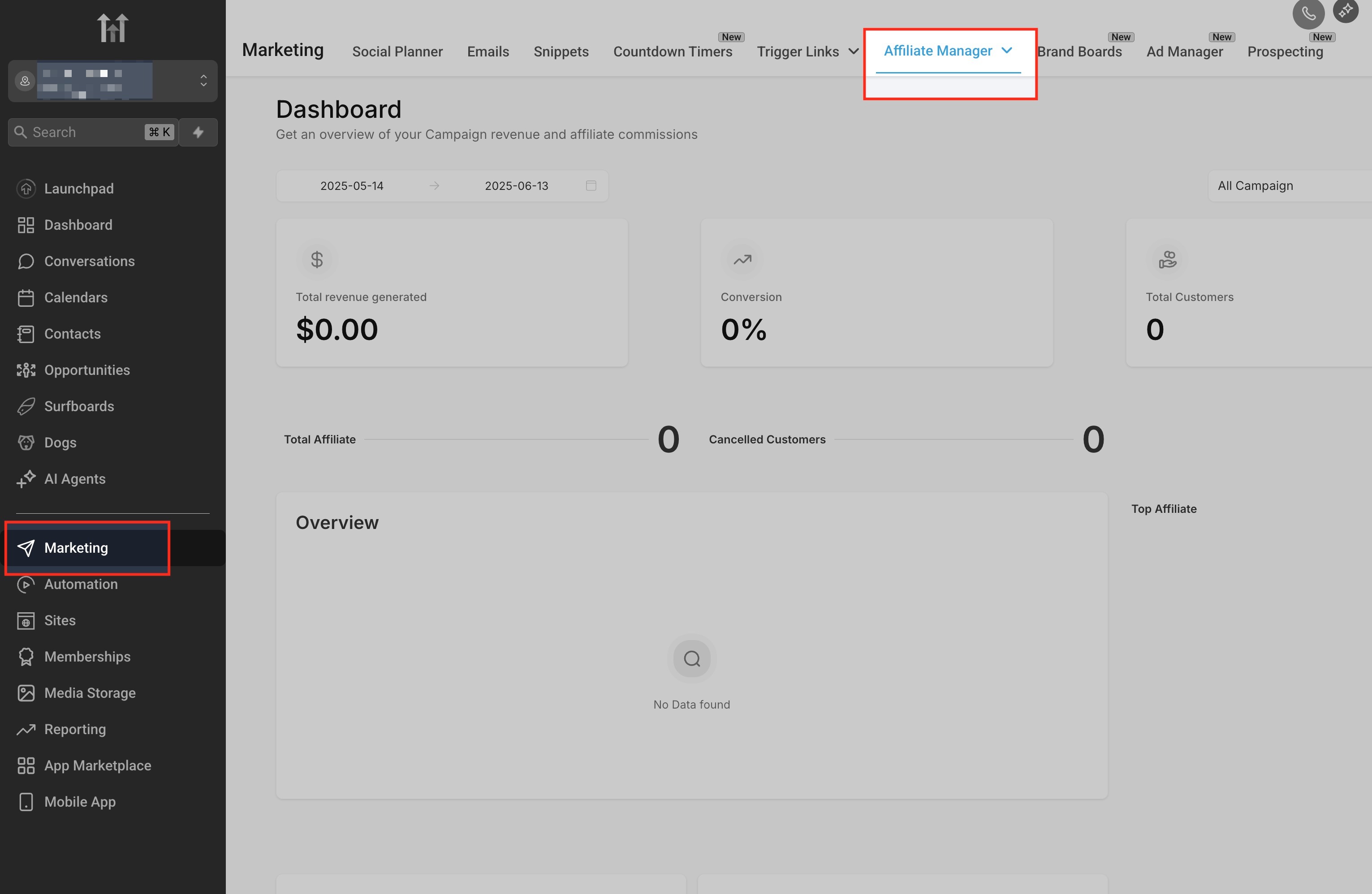Look for "Affiliate" option under the dropdown menu to see all the affiliates. click on any of the affiliate.