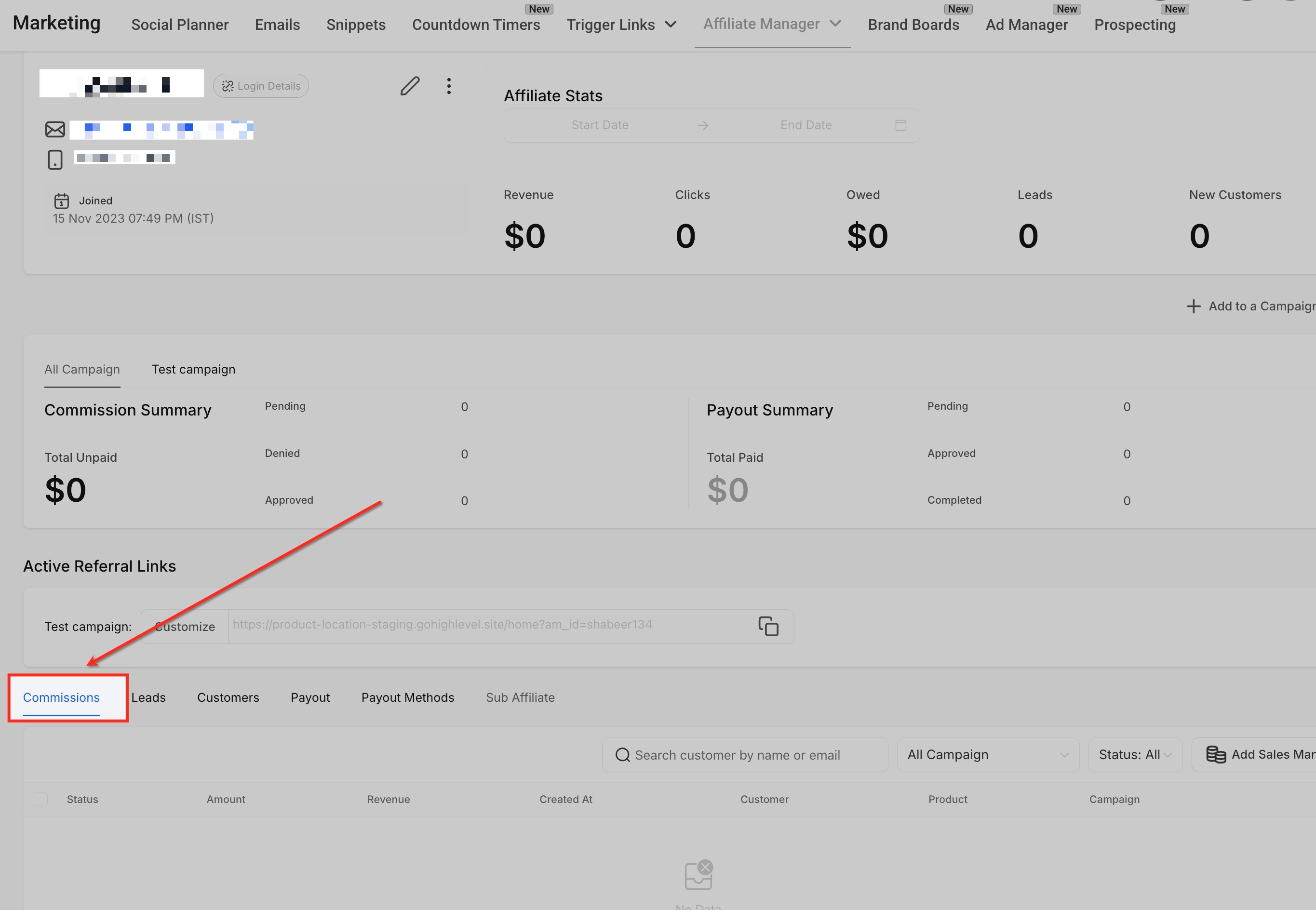 Once you are inside the affiliate profile, Click the Commissions tab.