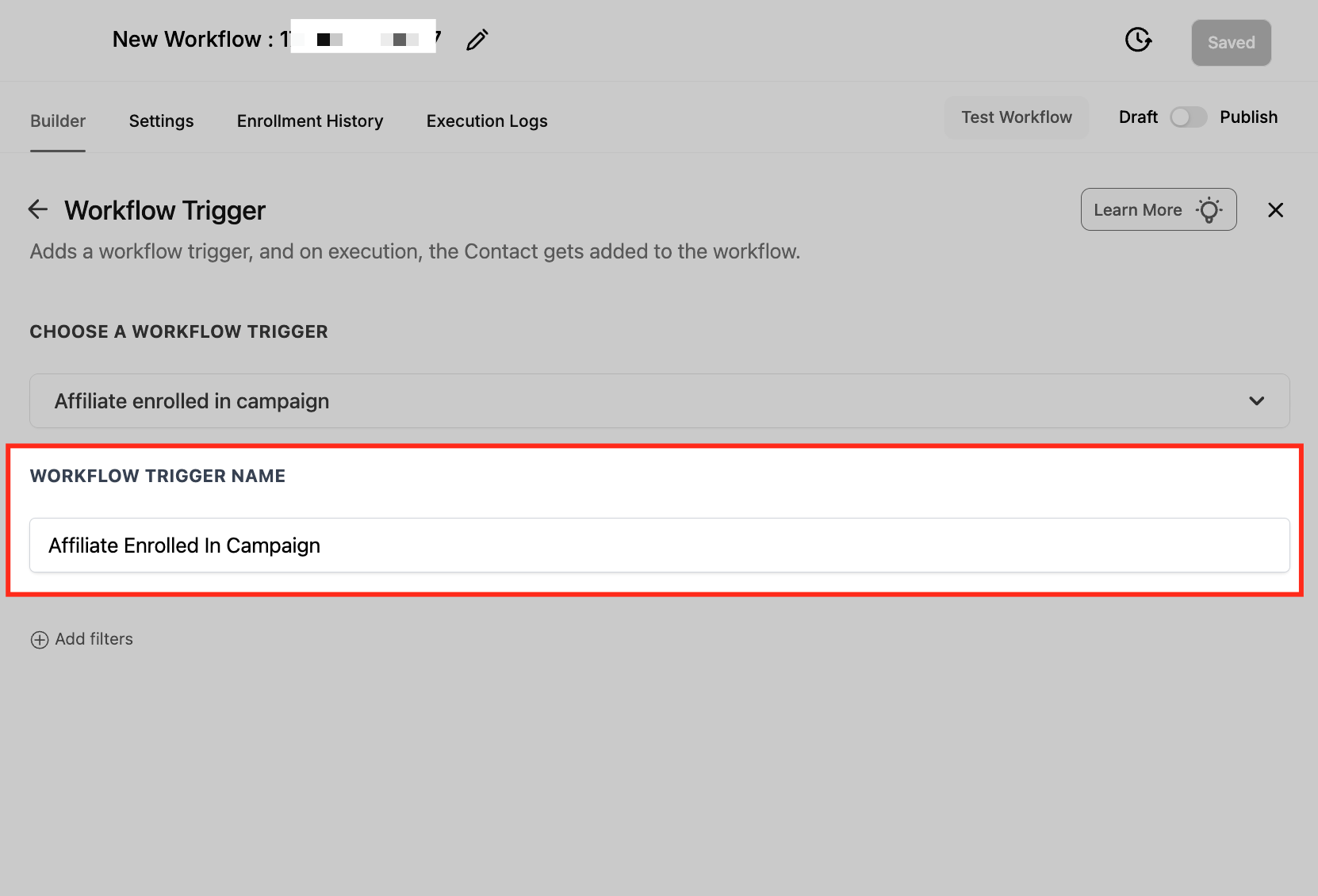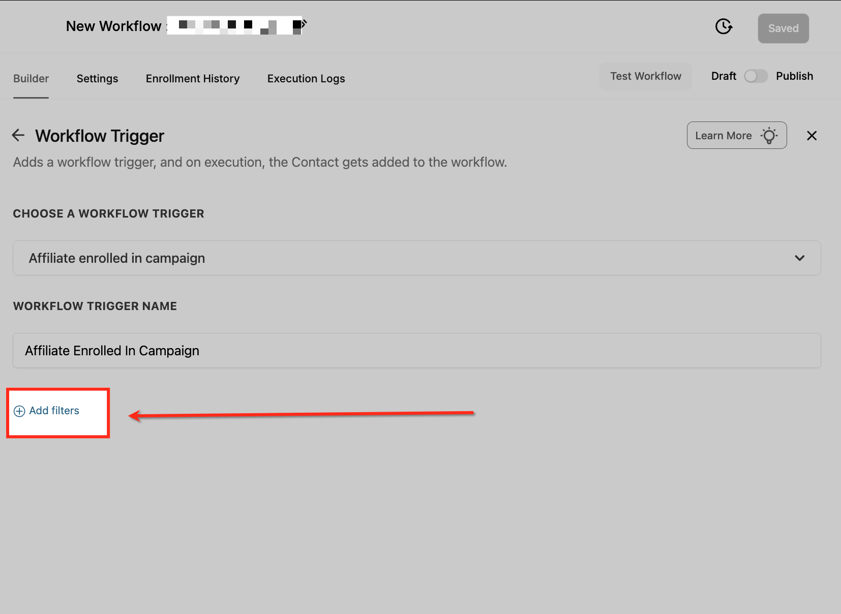 Click on “Add filters” to narrow down when this trigger should activate. Filters allow you to apply specific conditions like campaign name or custom fields so only relevant affiliate enrollments initiate the workflow.