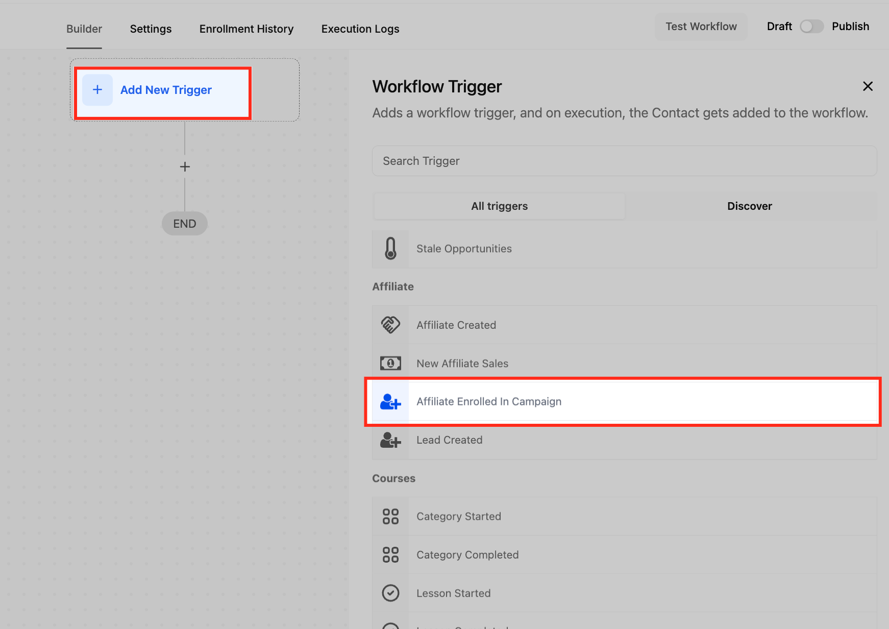 Click + Add New Trigger inside your workflow builder. From the trigger list, scroll to the Affiliate section and select Affiliate Enrolled In Campaign. This trigger activates the workflow when an affiliate joins a specific campaign.