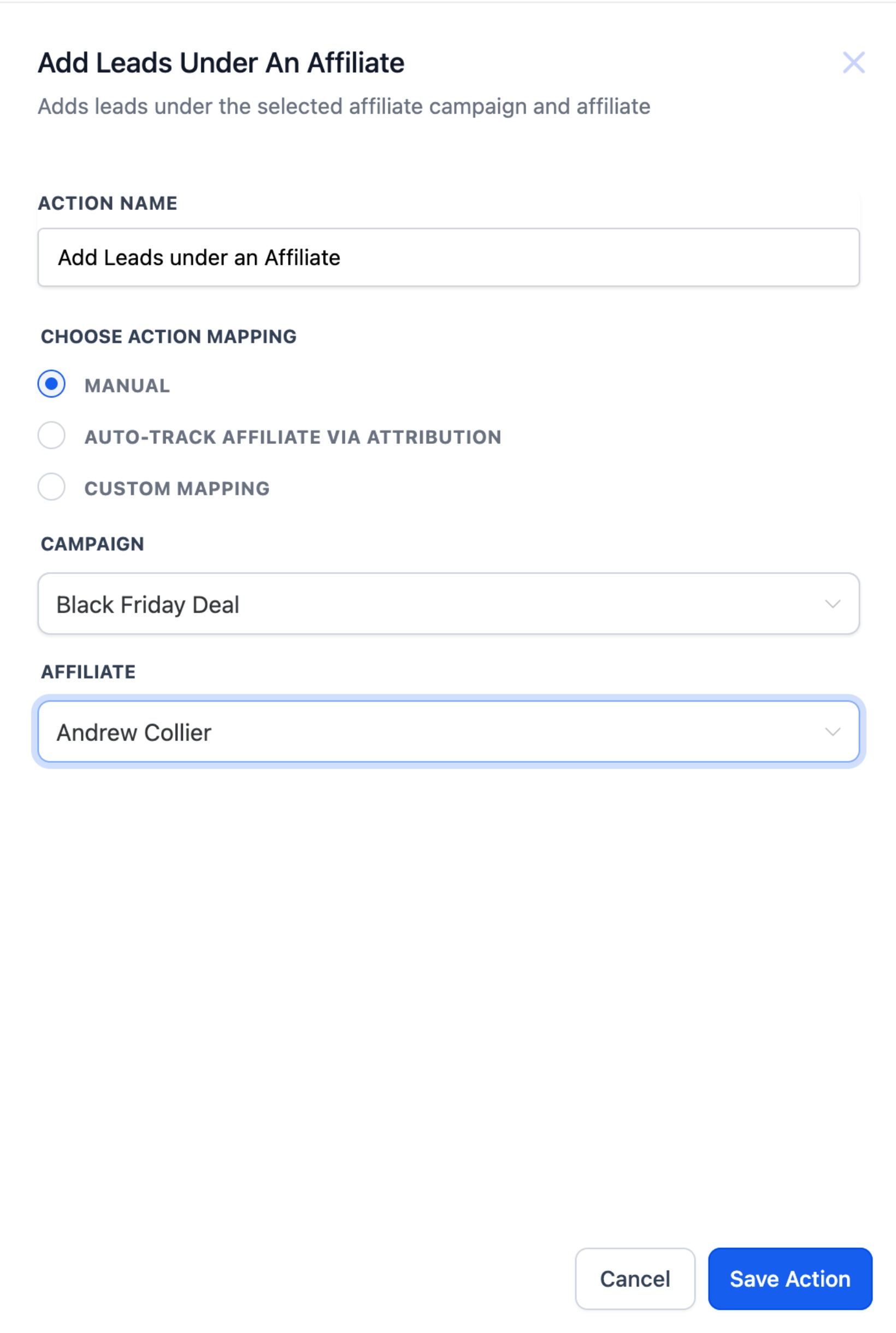 The "Add Leads under an Affiliate" action assigns a contact (lead) to an affiliate and their associated campaign, making sure affiliates are correctly credited.