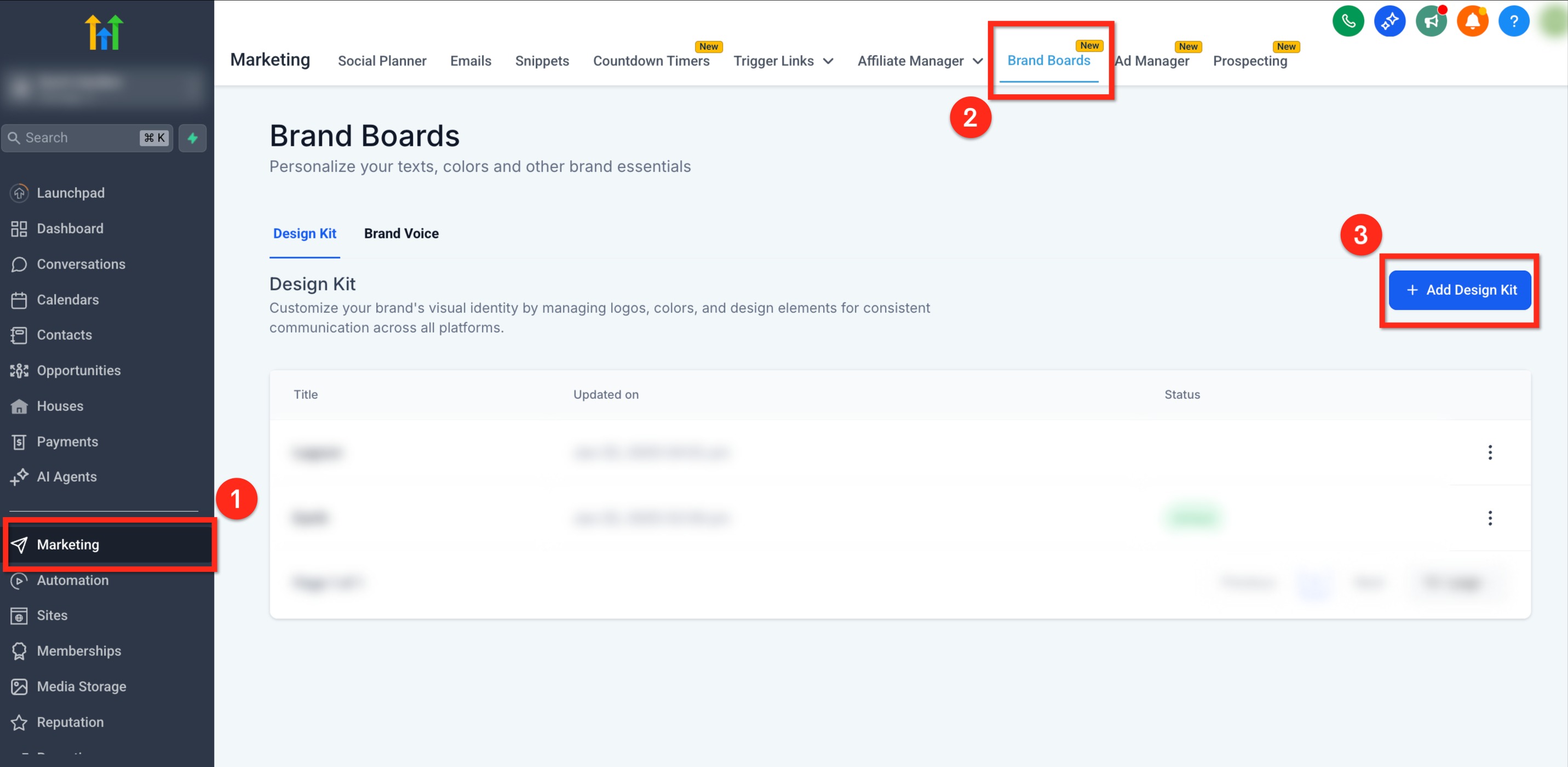 A Brand Board in HighLevel is a centralized space where you can define and manage your brand's visual identity. Each Brand Board contains a Design Kit that includes your logos, brand colors, and typography choices. Once set up, these assets can be easily applied across various parts of your account for a cohesive brand look.