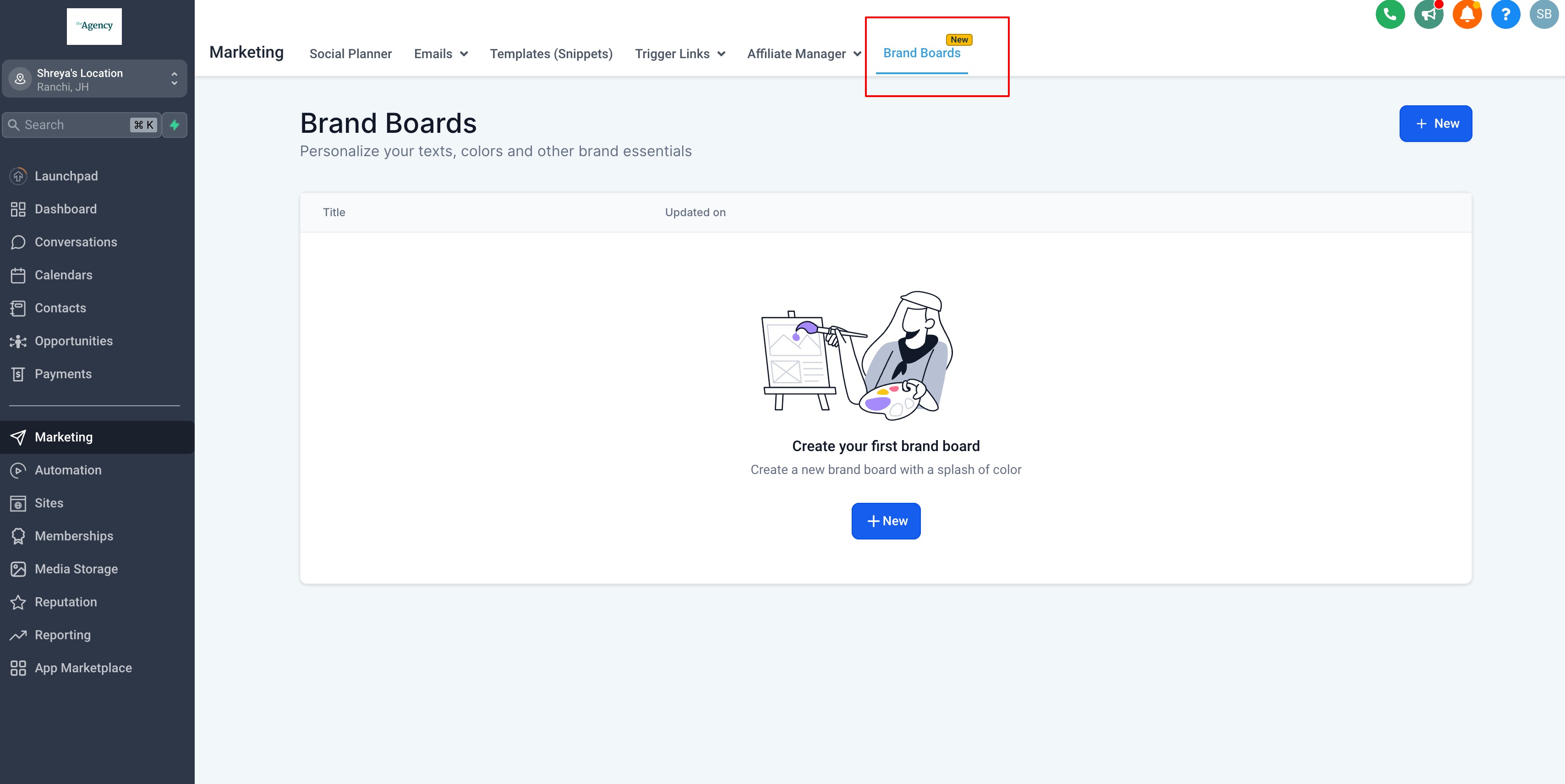 A Brand Board stores your core visual identity (colors, fonts, and logos) so you can apply consistent styling across HighLevel. Marking one board as the Default tells editors and pickers which branding guidelines to show within the editors, speeding up design and reducing mistakes. By default, the first brand board you create is set as the default.